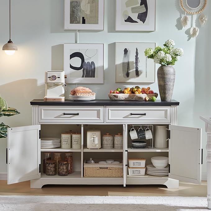 - Stunning Buffet Sideboard: Our Farmhouse Buffet Sideboard Cabinet is designed in a beautiful and elegant farmhouse style, adding a charming and rustic touch to any dining room or living area.
