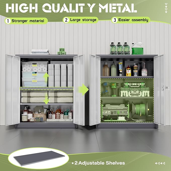 - 【Upgrade design】The metal storage cabinet features 2 adjustable shelves to accommodate items of various sizes. Each shelf can bear a weight of 180 pounds. There are reserved holes at the back of the cabinet for wall installation, and it has an anti-tipping design.
