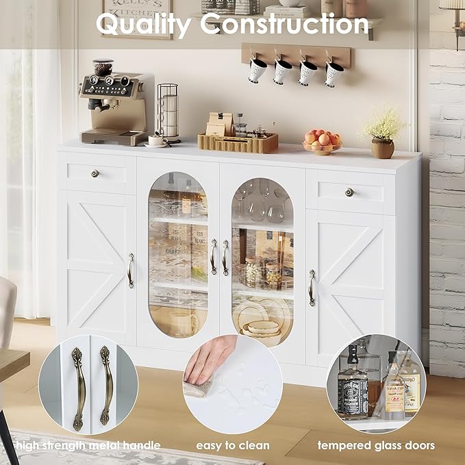 - Durable & Sturdy Furniture Cabinet: Made from high-quality wood, tempered glass, the sideboard cabinet is durable and long-lasting. The cabinet furniture wood is solid, and the textured white painted MDF surface is resistant to liquids, ensuring easy maintenance, while the top and shelves have a nice heft to it. Moreover, the drawer and cabinet doors open and close smoothly.