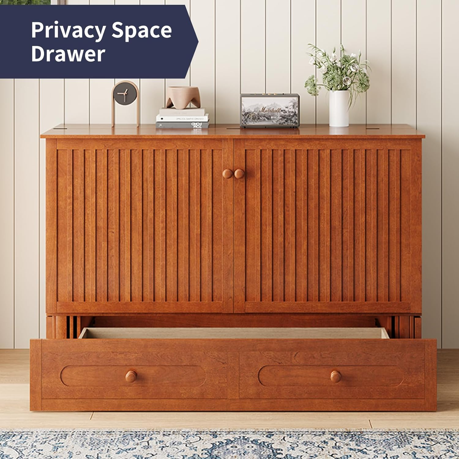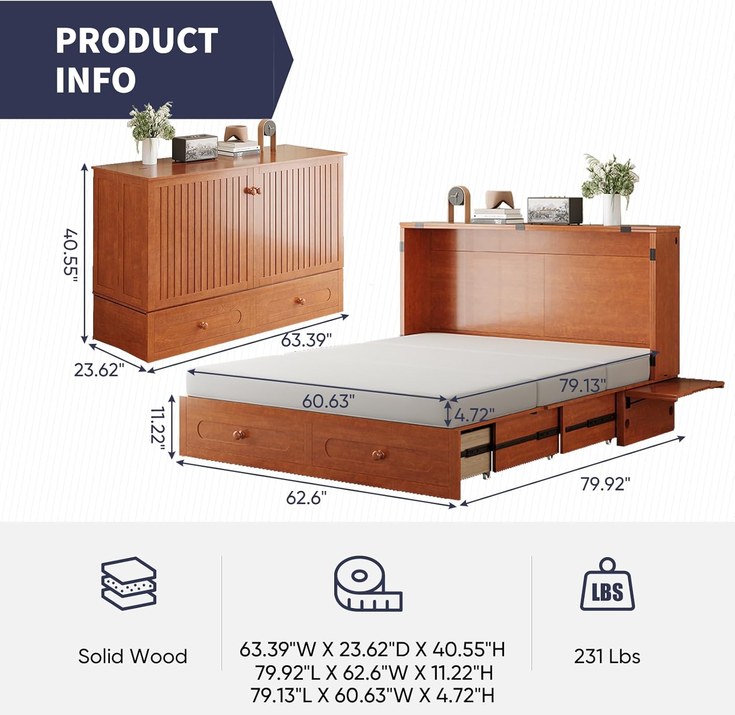 ijuicy Murphy Bed Queen Size with Foam Mattress, Side Storage Board, Cabinet Bed with Charging Station Large Storage Drawer for Space-Saving Room, Foldable Hideaway Bed Queen-Cherry