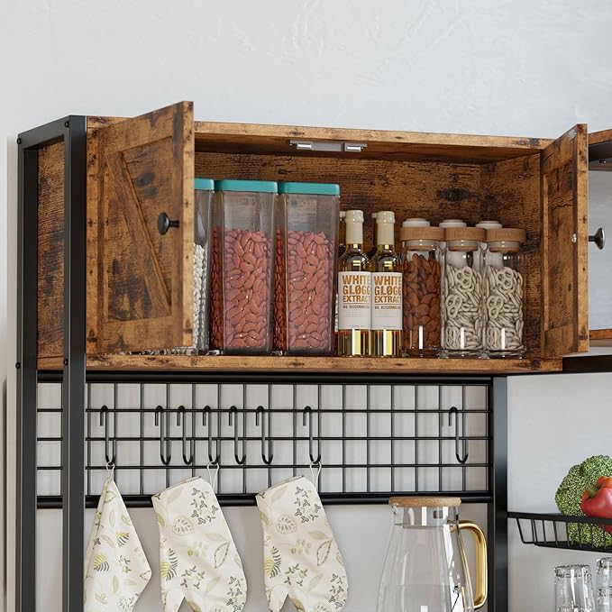 - Spacious Storage Rack: Includes 2 cabinets, open shelves, S hooks, metal grid, goblet holder, and wire basket. Ideal for microwaves, coffee bars, bakers, spices, and office storage.