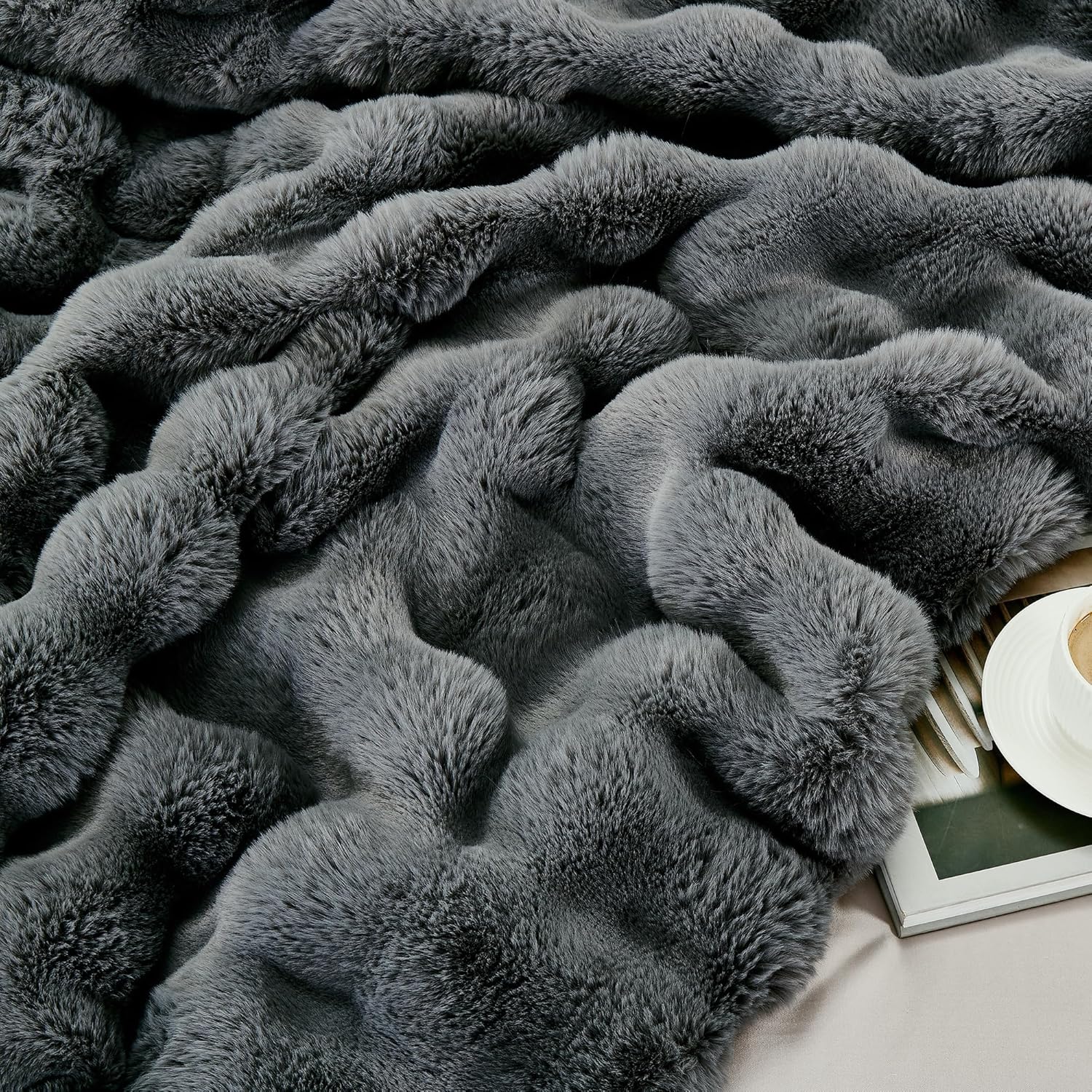 JONIYEAR Large Solid Thick Bubble Faux Rabbit Fur Bed Blanket Queen Size 80" x 90", Decorative Cute Cozy Fluffy Gray Warm Blanket for Winter,Reversible Big Luxe Fuzzy Comfy Shaggy Furry Blankets, Grey