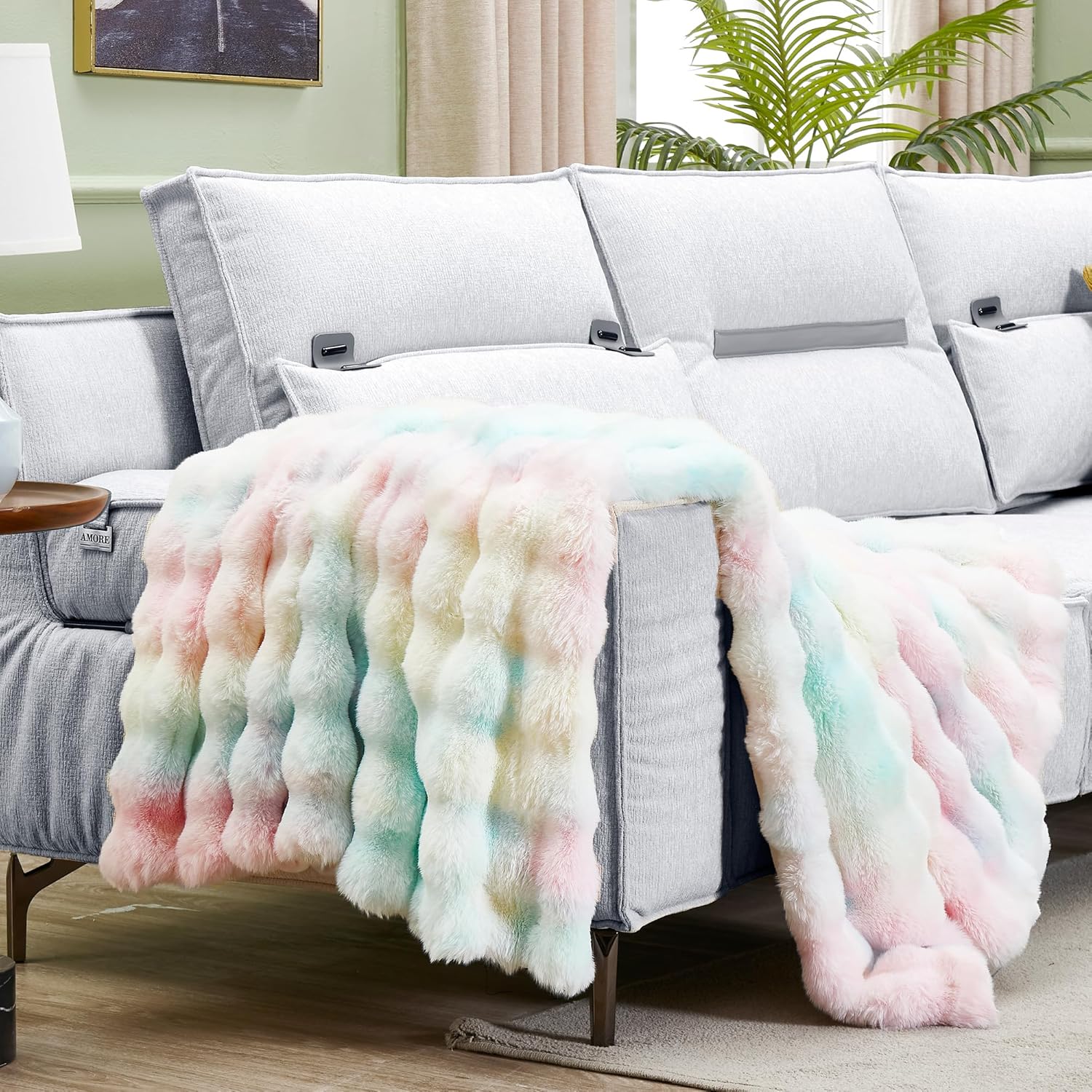 JONIYEAR Large Decorative Colorful Bubble Faux Rabbit Fur Bed Blanket Full Size 70" x 80", Soft Thick Warm Fluffy Blankets for Winter, Luxury Shag Big Cozy Fuzzy Furry Blanket for Women Girls, Rainbow