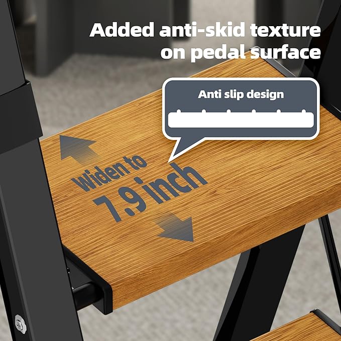 - ANTI-SLIP & WIDE PEDALS: This modern step ladder features large pedal steps with prominent parallel lines on the surface to prevent slipping. The wide pedals offer ample space for safe ascent and descent, allowing users to stand securely.