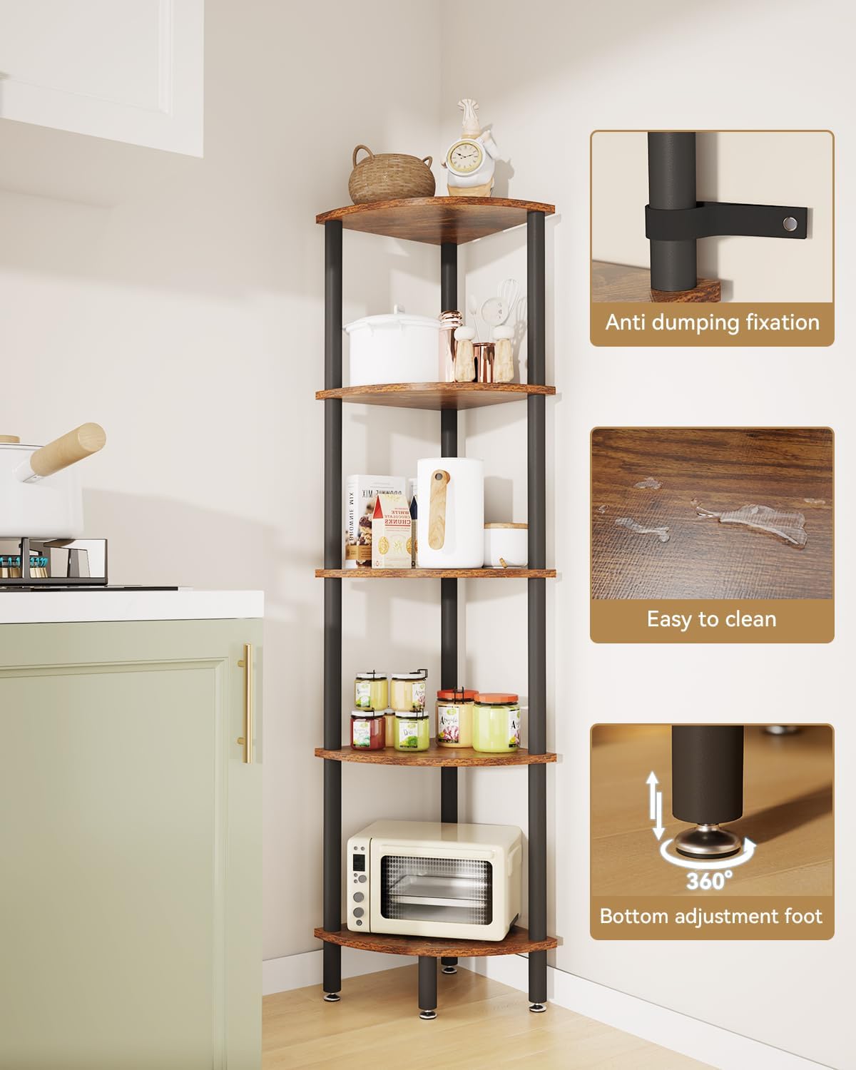 IBUYKE 5 Tier Corner Shelf Stand,Industrial Corner Display Rack,Corner Bookshelf for Living Room, Bedroom, Kitchen, Home Office, Brown WBC010H
