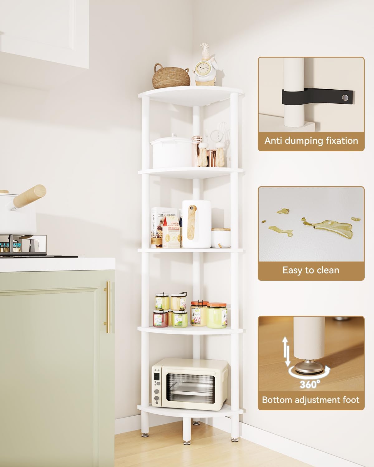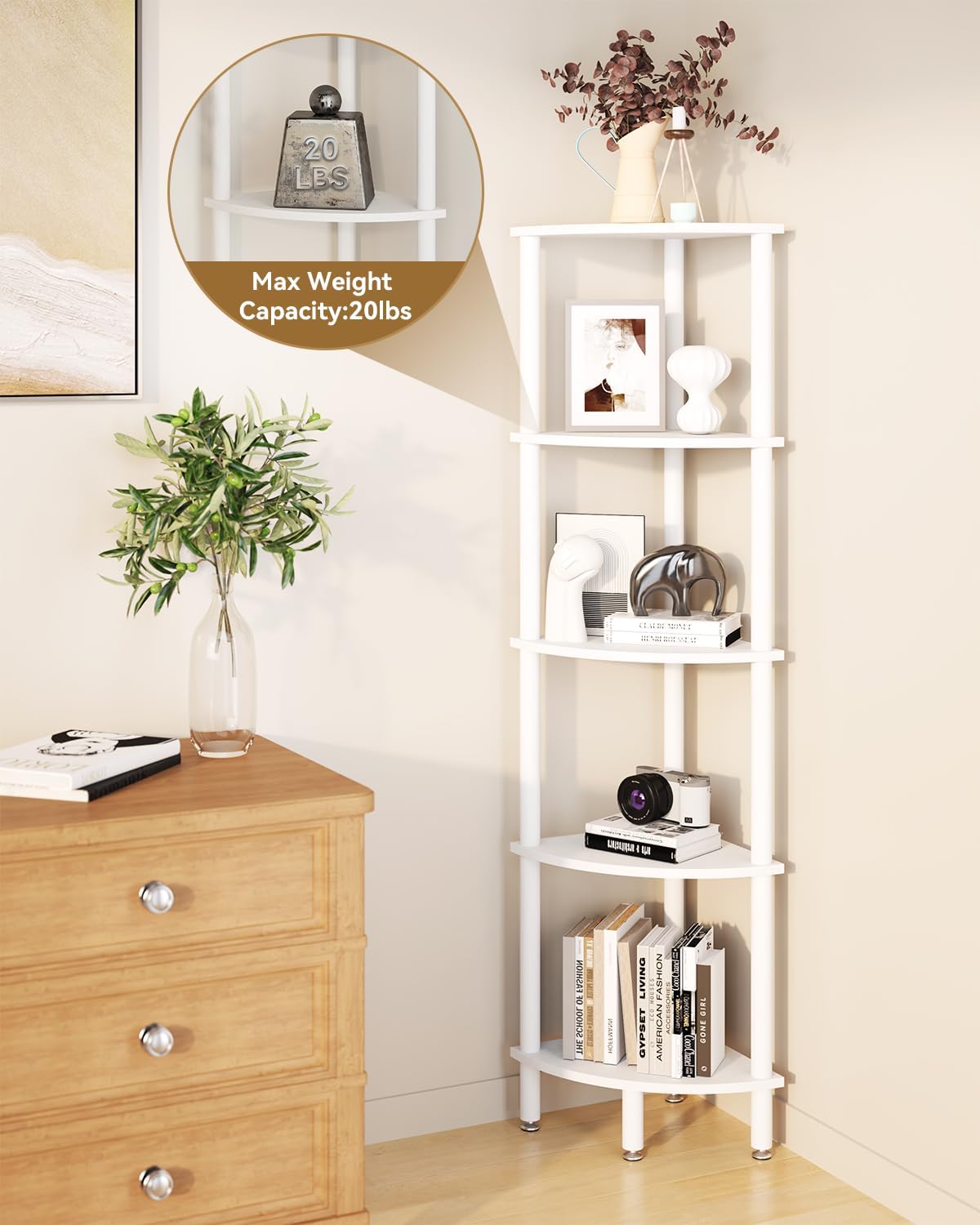 IBUYKE 5 Tier Corner Shelf Stand,Industrial Corner Display Rack,Corner Bookshelf for Living Room, Bedroom, Kitchen, Home Office, White WBC010W