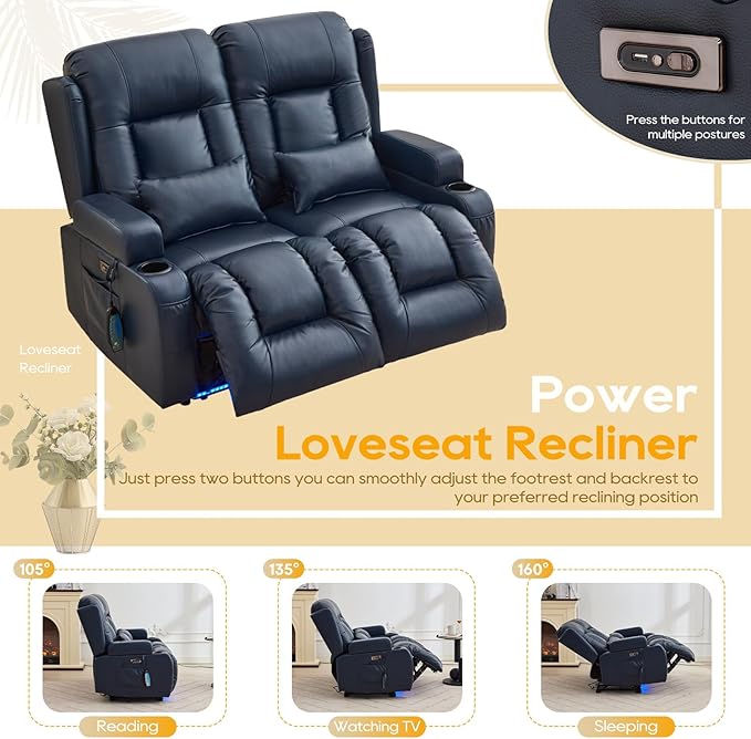IPKIG 54" Power Loveseat Recliner Sofa, Electric Home Theater Seating with Massage Heat/4 Colors Ambient Lights/USB Port/Side Pocket/Cup Holder for Living Room, Bedroom, Home (Blue, 2 Seater)