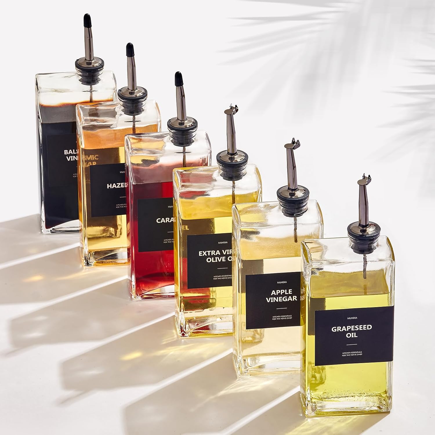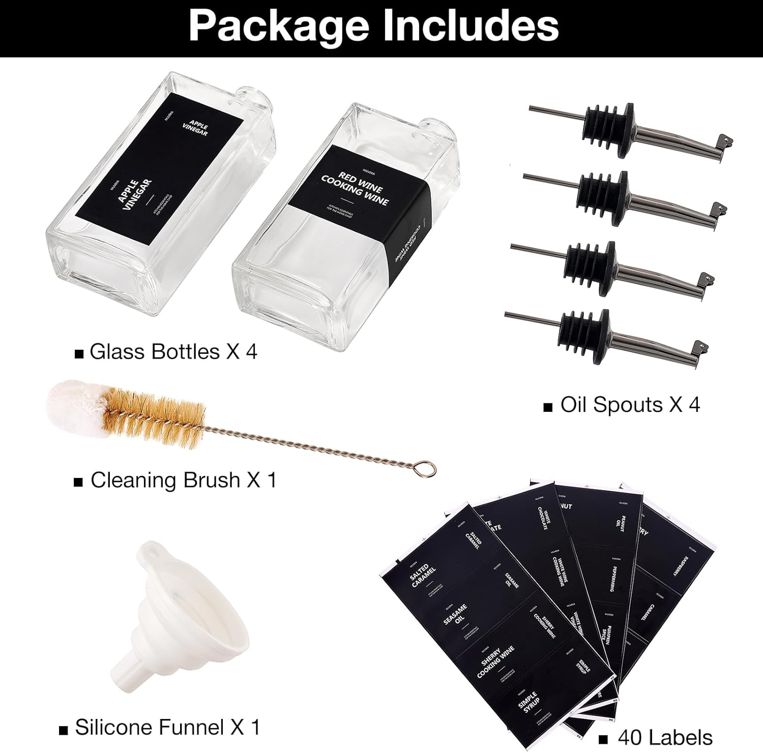 - 【Thoughtful Design & Effortless Convenience】: Every oil and vinegar dispenser bottle set comes with 4 olive oil dispenser bottles, 4 weighted self-closing spouts, 1 collapsible funnels, 1 cleaning brush and 40 labels. The oil dispensers for the kitchen are also practical for holding or dispensing oil, vinegar, soy sauce, cooking wine, or mouthwash. This 4 pack oil dispensing set meets most of your daily needs and is prefect to share with your friends and families.