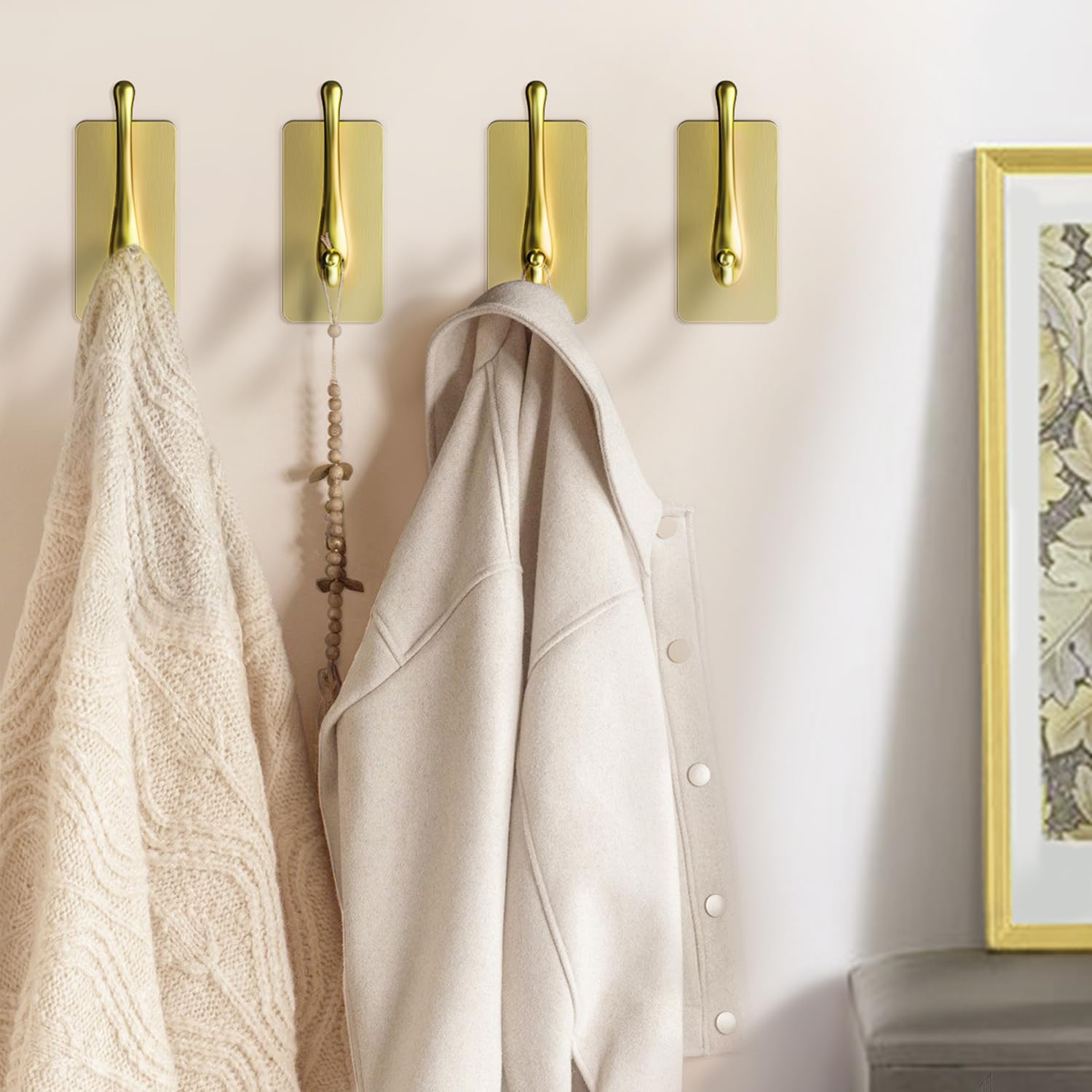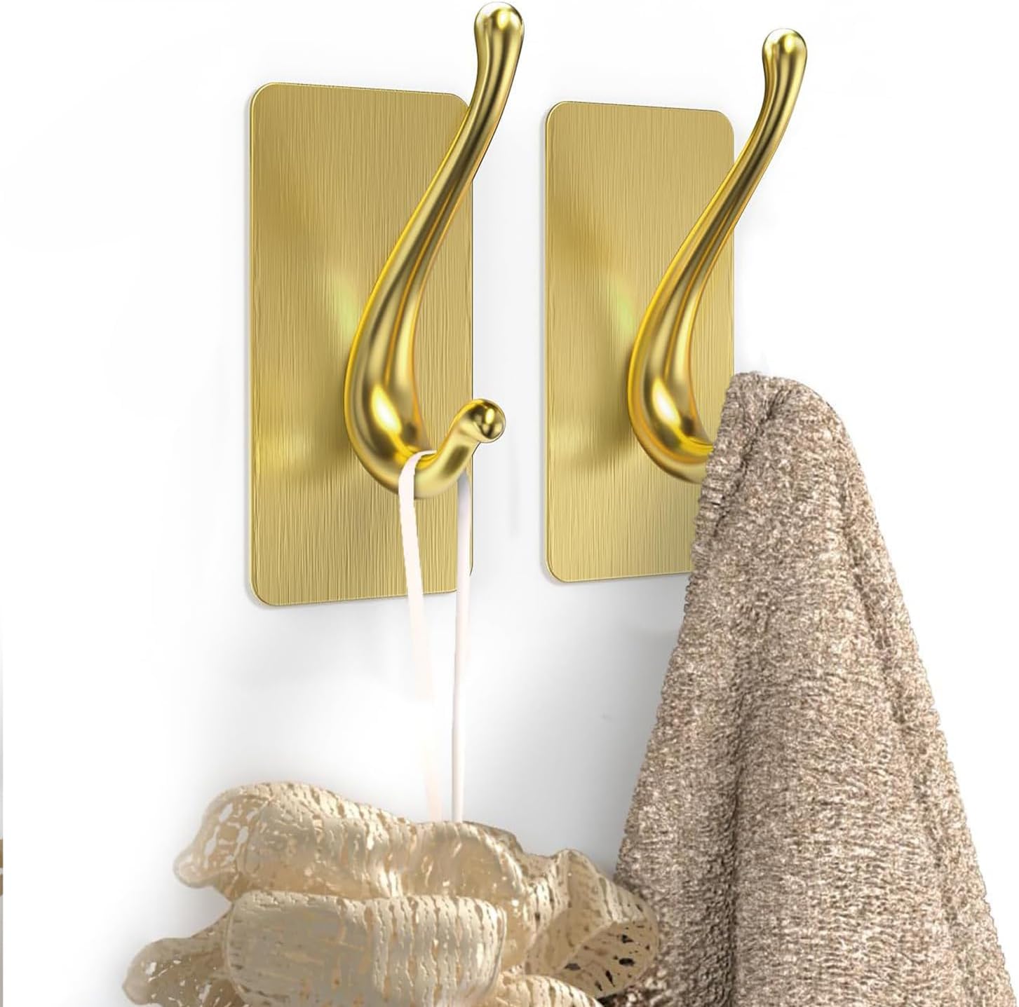 Towel Hooks, Solid Alloy Adhesive Wall Hooks for Hanging, Towel Hooks for Bathroom, RV, Kitchen, Closets, etc (Bright Gold, 2 Pack)