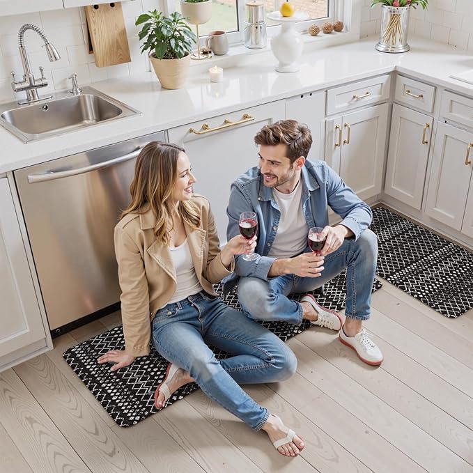 KIMODE Anti Fatigue Mats for Kitchen Floor 17"x47"+17"x29", Black Boho Kitchen Rugs Sets of 2, Cushioned Kitchen Floor Mats, Non Slip Standing Mats for Sink Laundry Office Desk