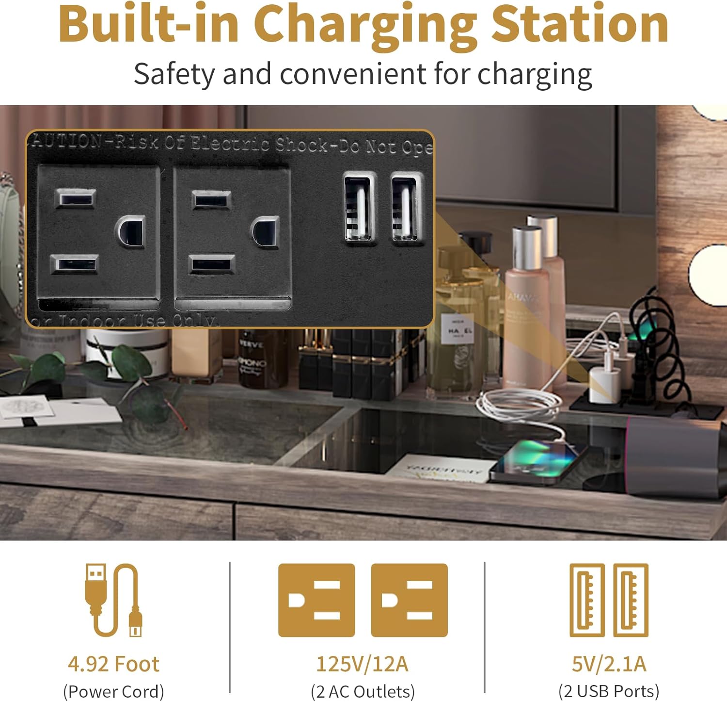 - Convenient Charging Station with USB Ports: The built-in power strip includes 2 standard plug sockets and 2 USB ports, making it easy to charge your devices or use your hair dryer and curling iron while seated at your vanity.
