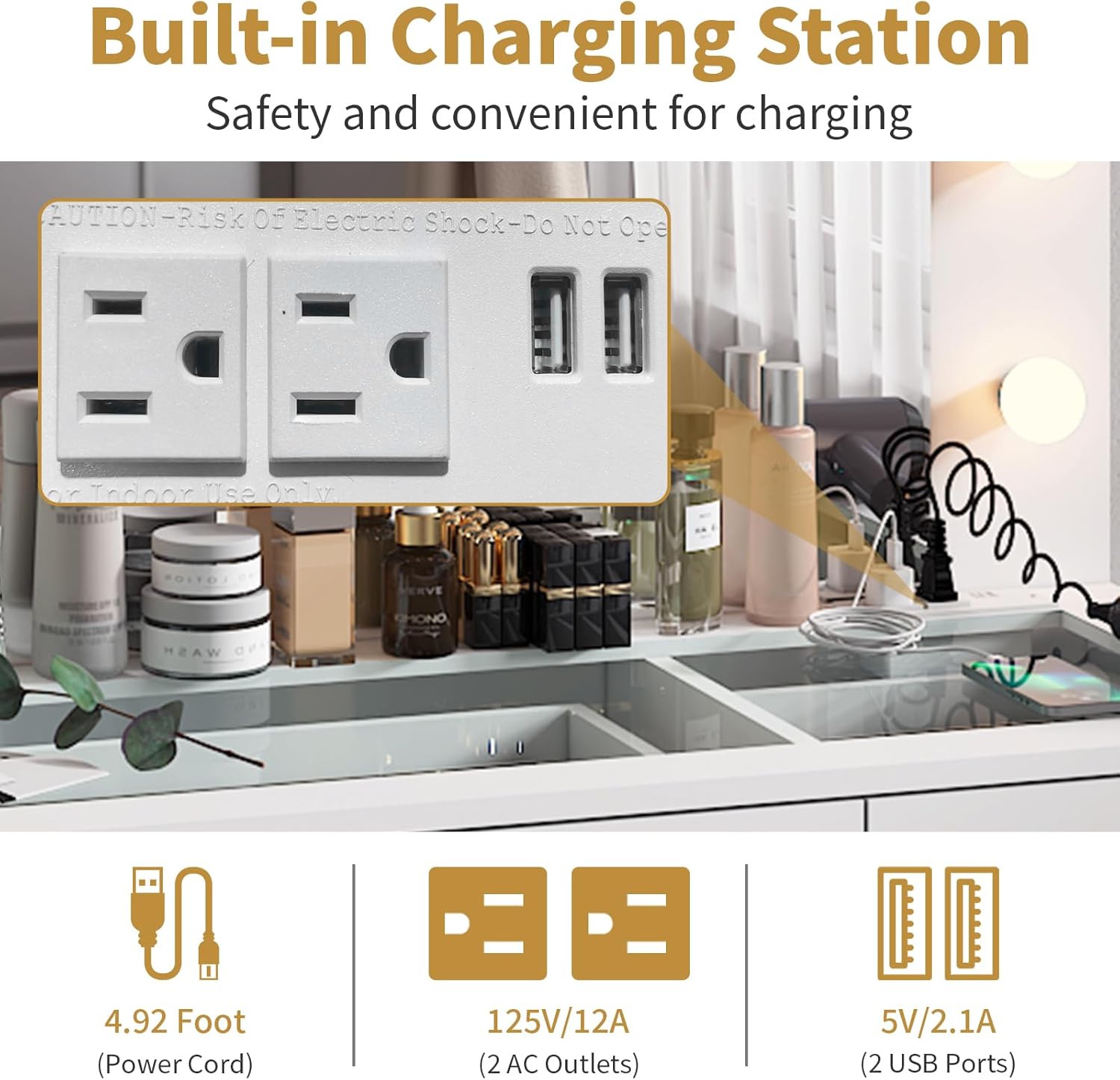 - Convenient Charging Station with USB Ports: The built-in power strip includes 2 standard plug sockets and 2 USB ports, making it easy to charge your devices or use your hair dryer and curling iron while seated at your vanity.