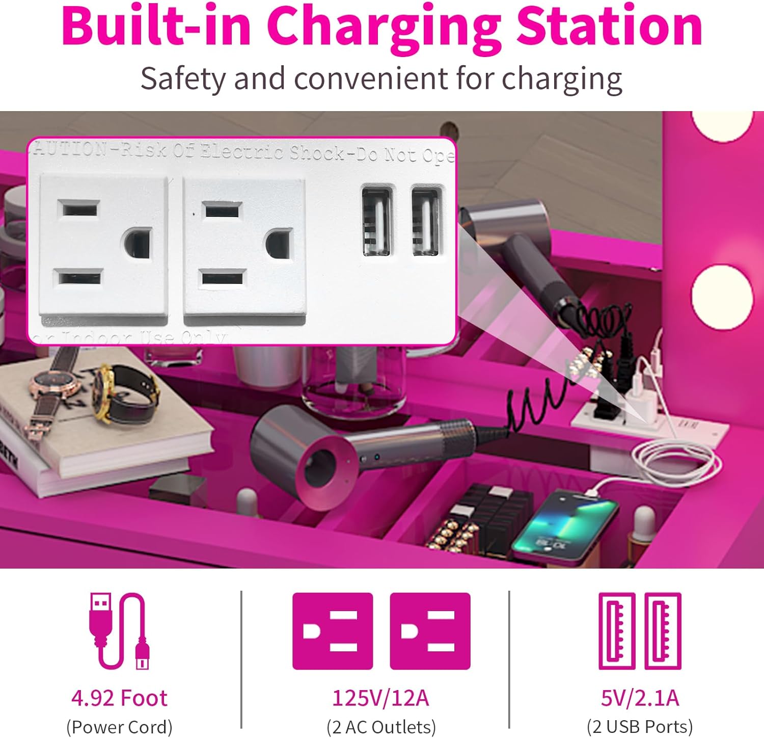 - Convenient Charging Station with USB Ports: The built-in power strip includes 2 standard plug sockets and 2 USB ports, making it easy to charge your devices or use your hair dryer and curling iron while seated at your vanity.