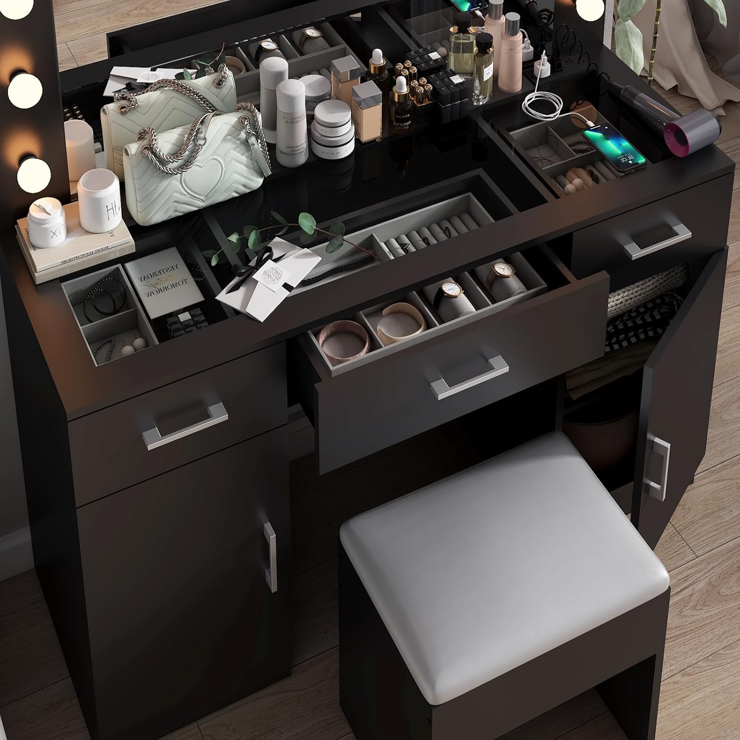 - Ample Storage Space: Organize and store all your makeup, skincare products, hairstyling tools, jewelry, and accessories in the three spacious drawers and two roomy cabinets, keeping everything neat and within reach.