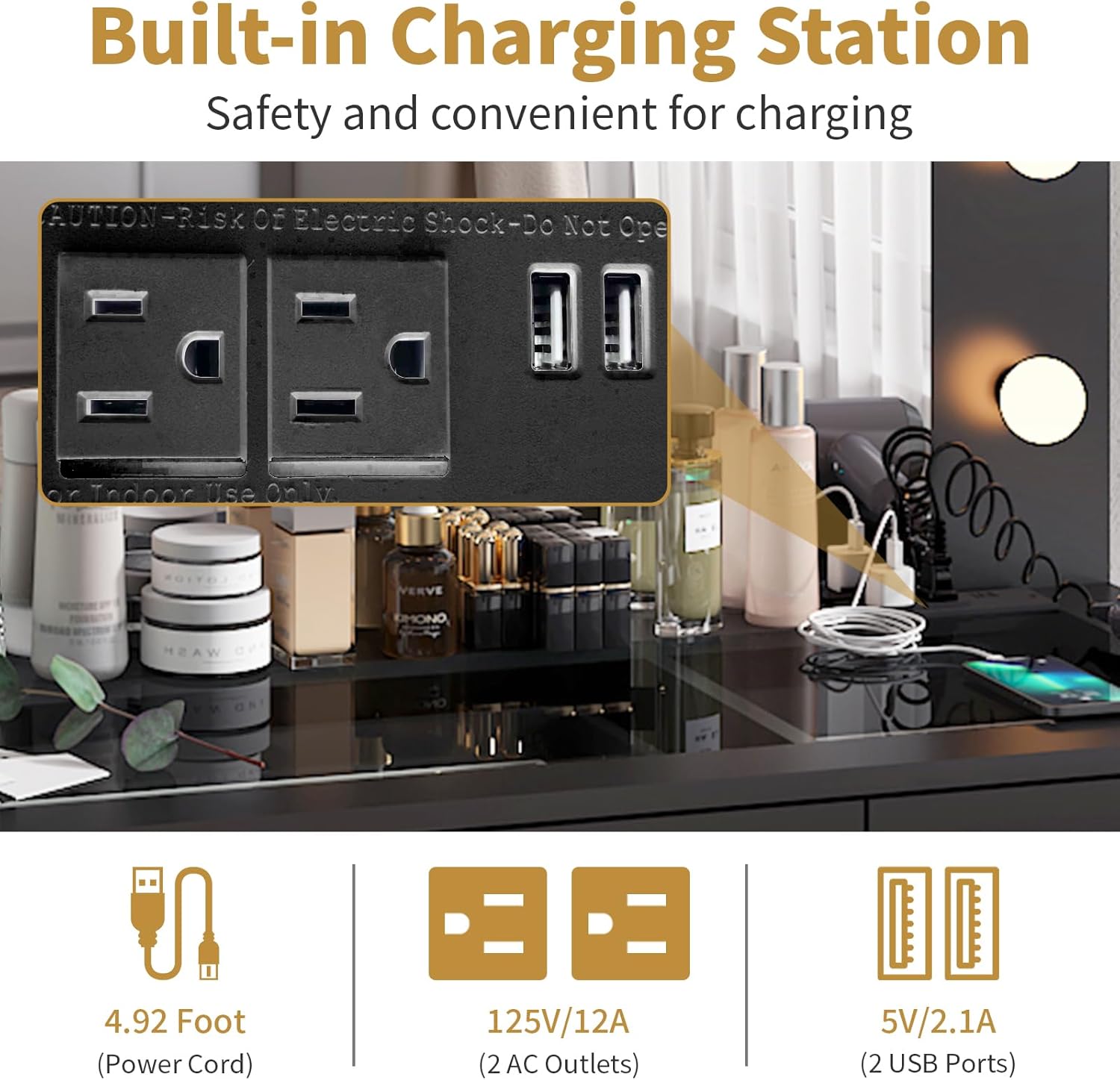 - Convenient Charging Station with USB Ports: The built-in power strip includes 2 standard plug sockets and 2 USB ports, making it easy to charge your devices or use your hair dryer and curling iron while seated at your vanity.