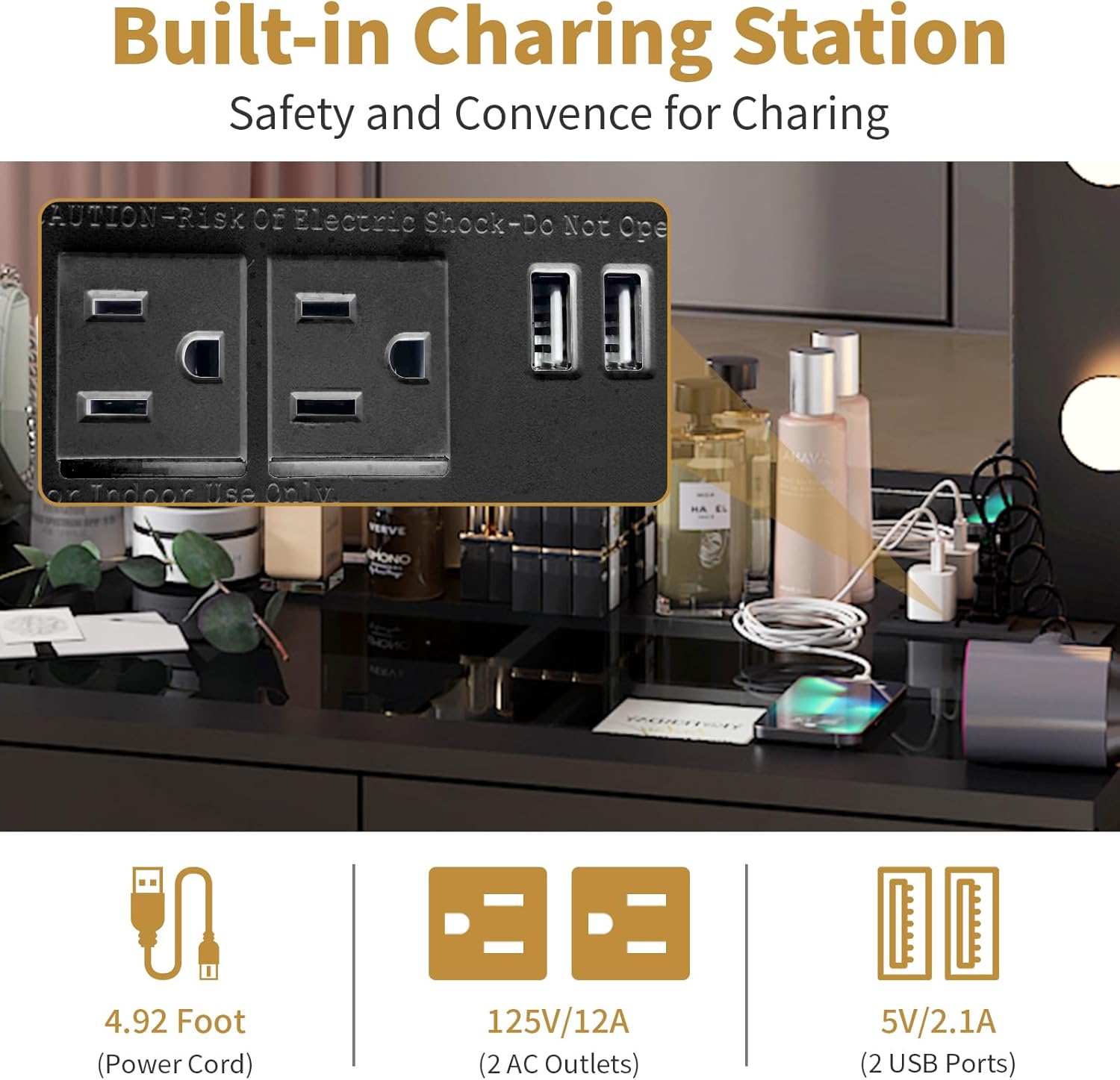 - Convenient Charging Station with USB Ports: The built-in power strip includes 2 standard plug sockets and 2 USB ports, making it easy to charge your devices or use your hair dryer and curling iron while seated at your vanity.
