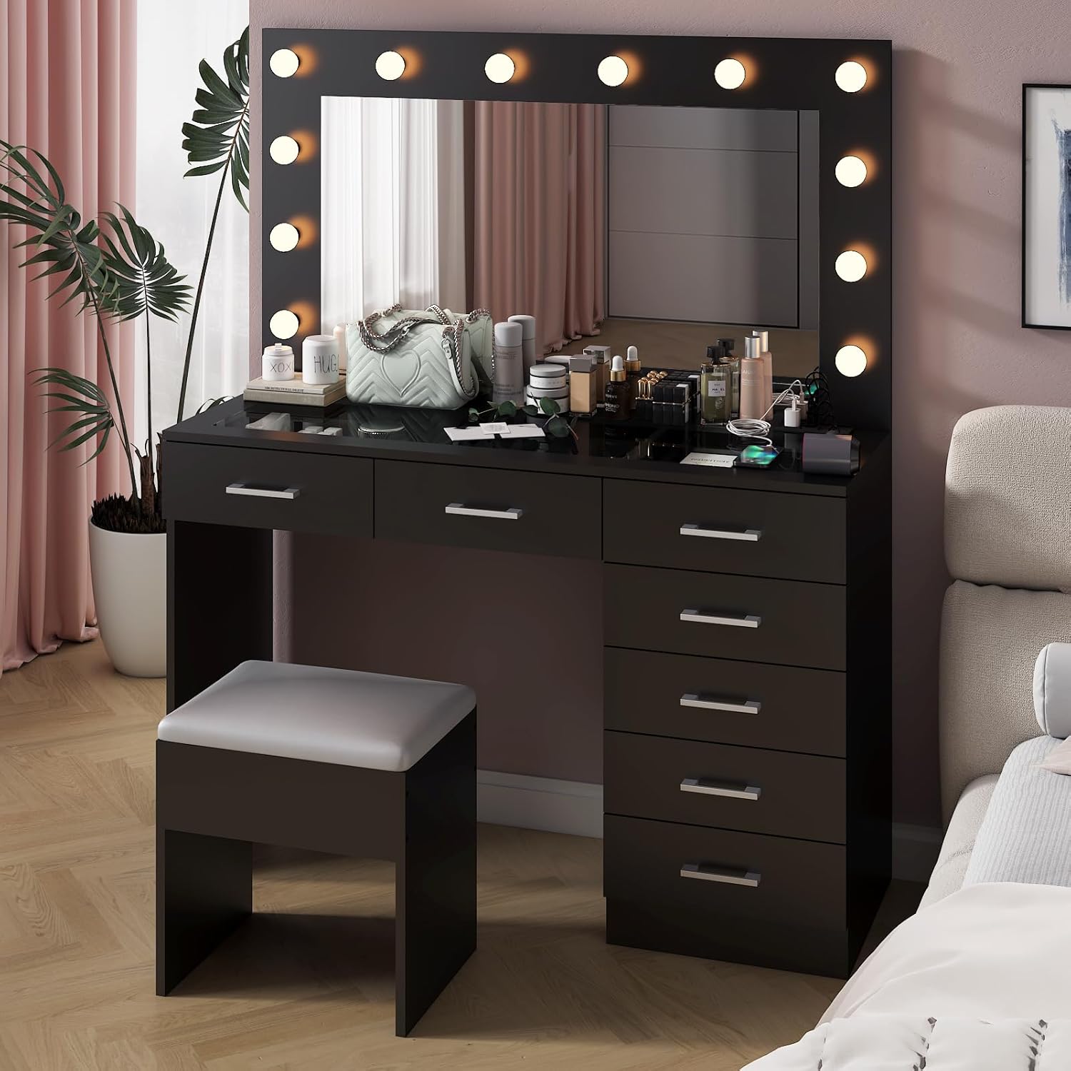 Karl home Vanity Desk with Large Lighted Mirror & Powre Outlet, Glass Tabletop Makeup Vanity Set with 7 Drawers, 45.3" Vanity Table with 3 Color Lighting Modes, Dressing Table for Women Girls, Black