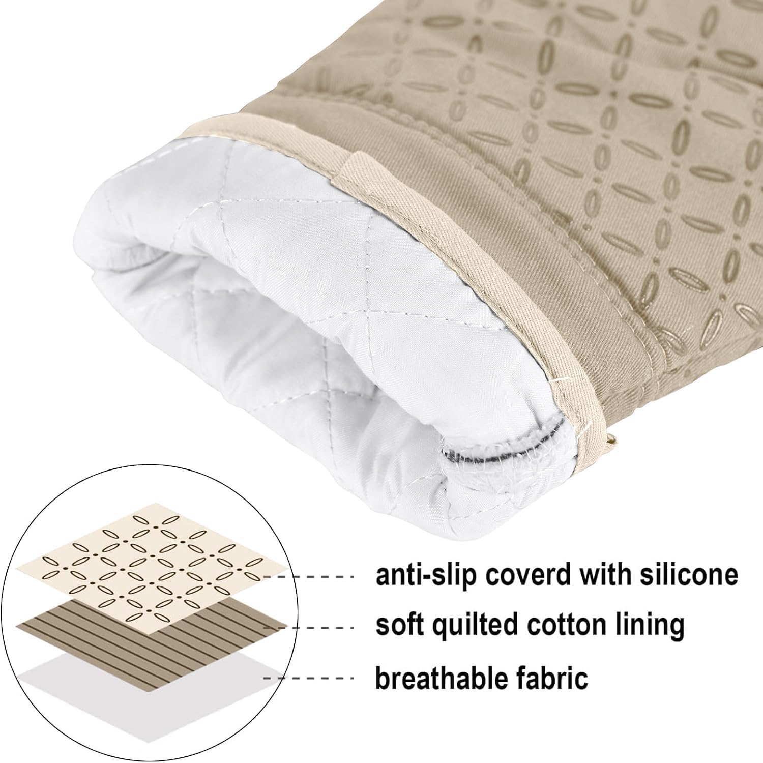 KEGOUU Oven Mitts and Pot Holders 6pcs Set, Kitchen Oven Glove High Heat Resistant 500 Degree Extra Long Oven Mitts and Potholder with Non-Slip Silicone Surface for Cooking (Almond)