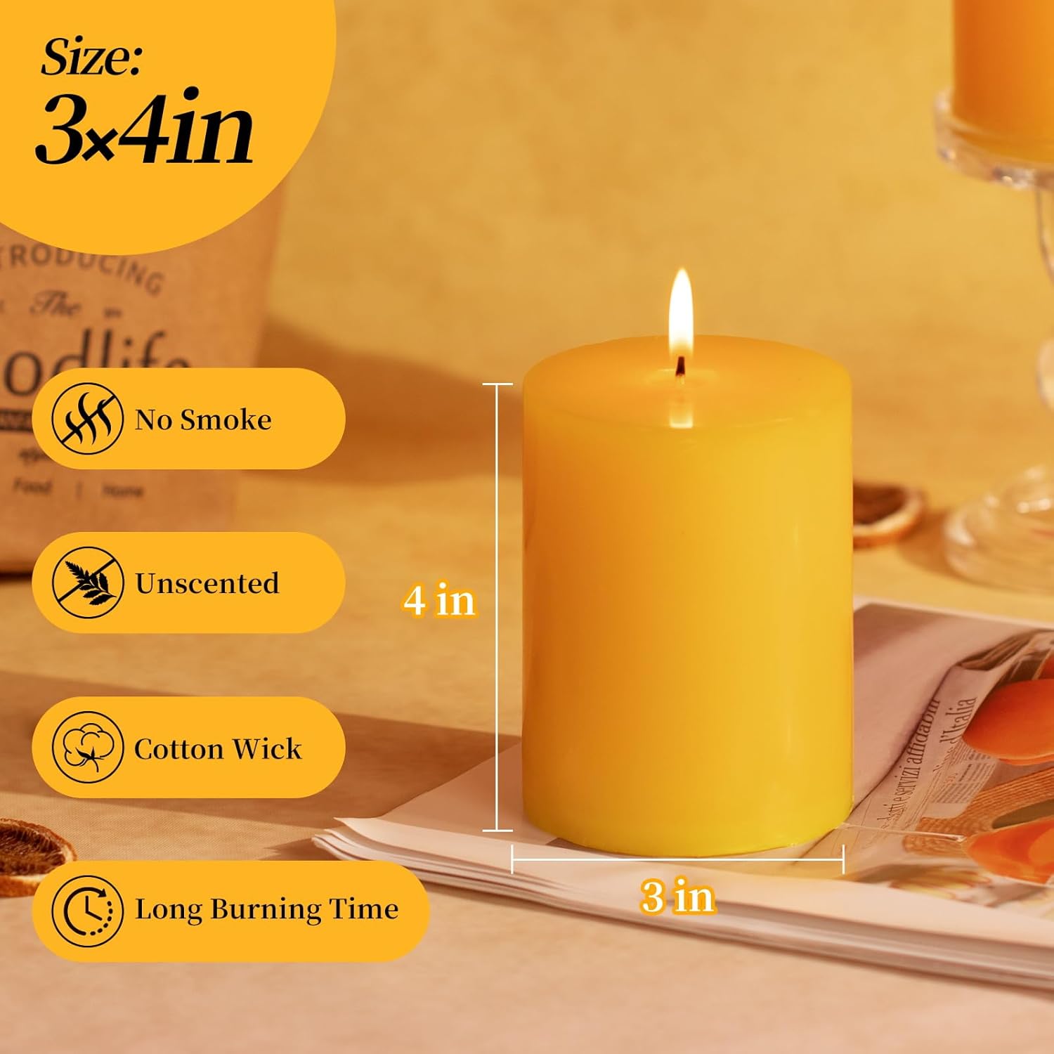 KONNI Yellow Pillar Candles Set of 3, 3"x 4" Unscented Pillar Candles Bulk, 39 Hours Long Burning Candles, Smokeless&Dripless Large Round Candle for Wedding, Home Decoration, Parties, Spas, Dinner