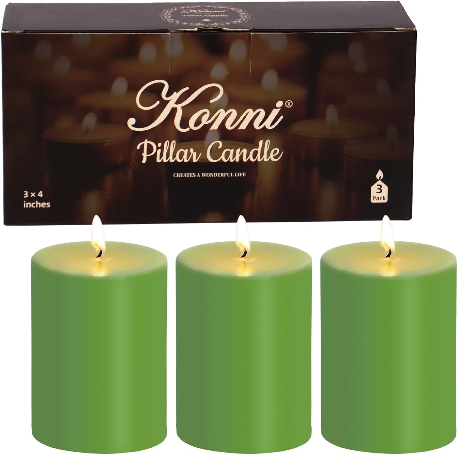 KONNI Green Pillar Candles Set of 3, 3"x 4" Unscented Pillar Candles Bulk, 39 Hours Long Burning Candles, Smokeless&Dripless Large Round Candle for Wedding, Home Decoration, Parties, Spas, Dinner