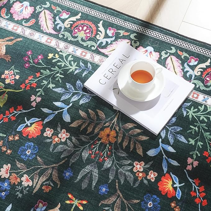 Area Rug 4x6 Rug Washable Rugs Floral Non Slip Low Pile Small Carpet for Bedroom, Bedside, Kids Room, Office, Dining Room (Emerald Green)