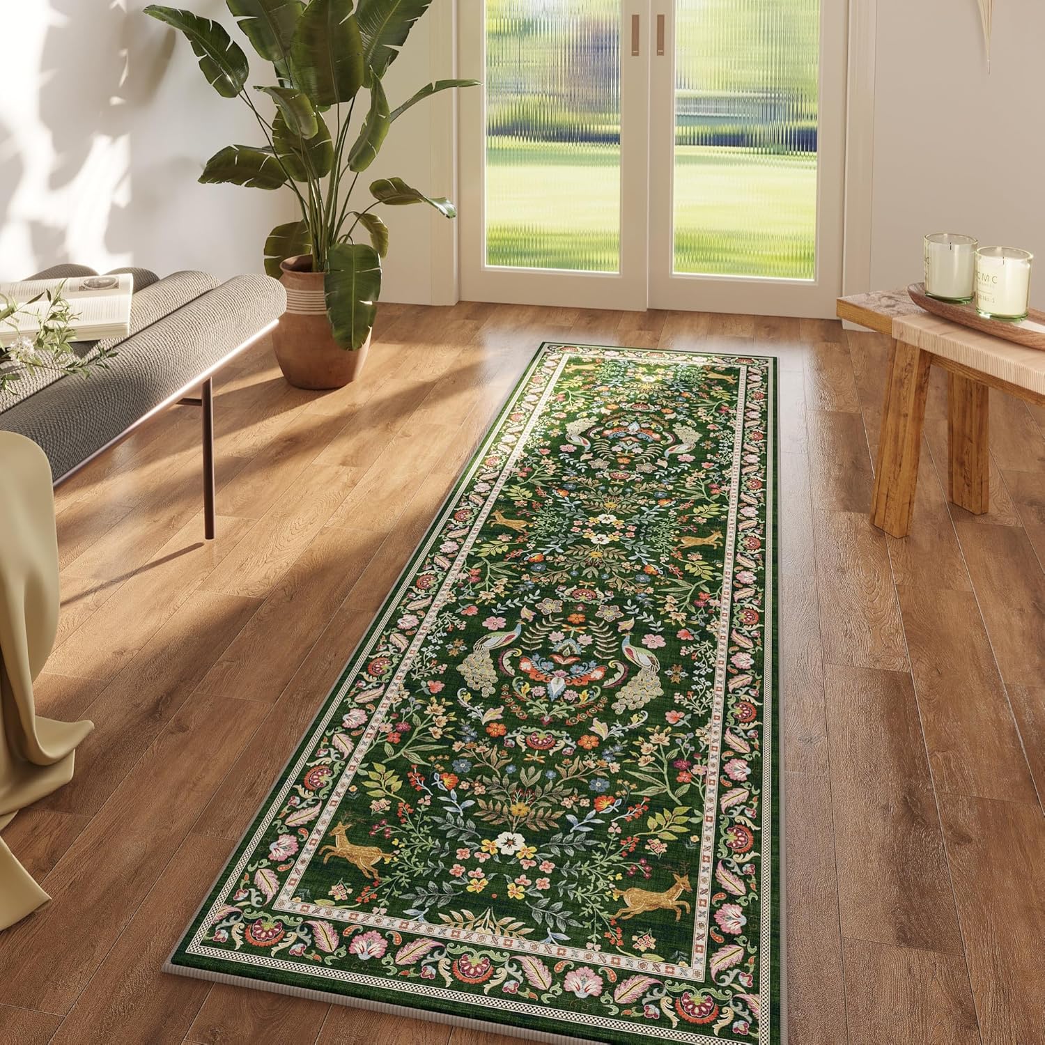 Runner Rug Washable Kitchen 2'x6' Floral Non-Slip for Entryway Indoor Soft Carpet Runner for Hallways, Kitchen, Laundry, Bedroom, Bathroom (Emerald Green)