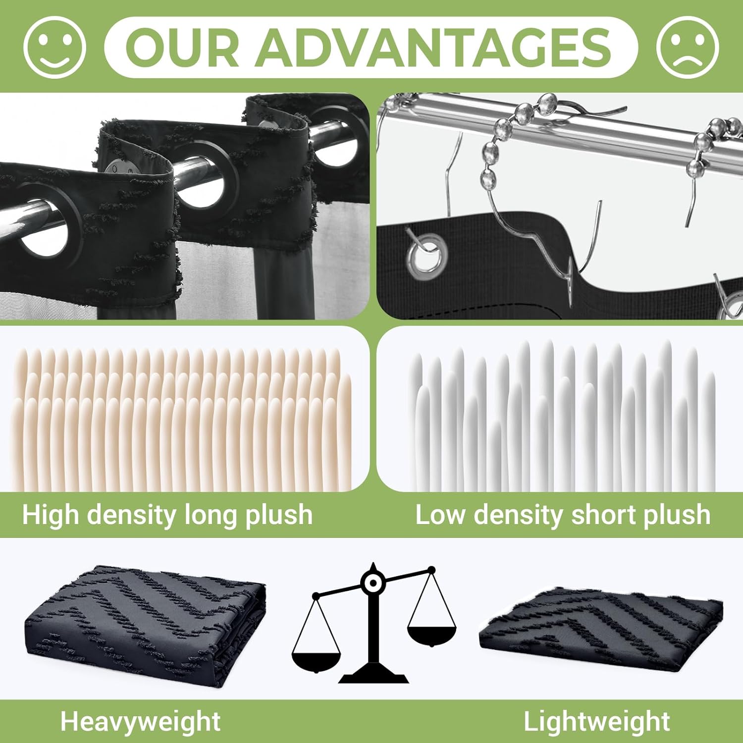 - 【3-in-1 Shower Curtain Set】This shower curtain set features a outer shower curtain with a see-through window, inner Liner, and built-in rings for easy installation. It makes no noise while sliding, perfect for early morning shower