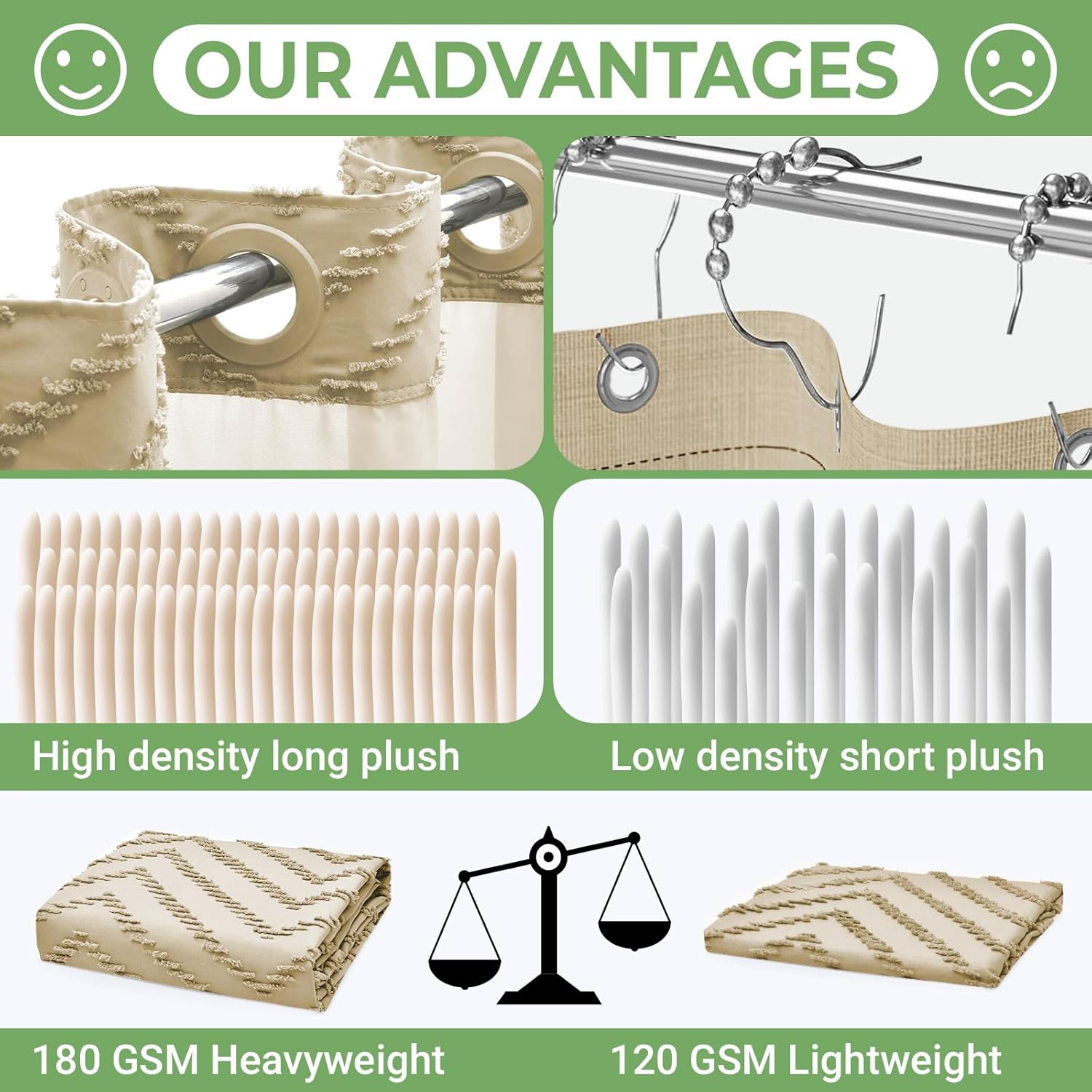 Extra Long No Hook Shower Curtain with Snap in Liner, Tufted Chevron Striped Shower Curtain Set for Bathroom, Boho Waterproof and Washable Shower Curtains,71Wx86H, Khaki