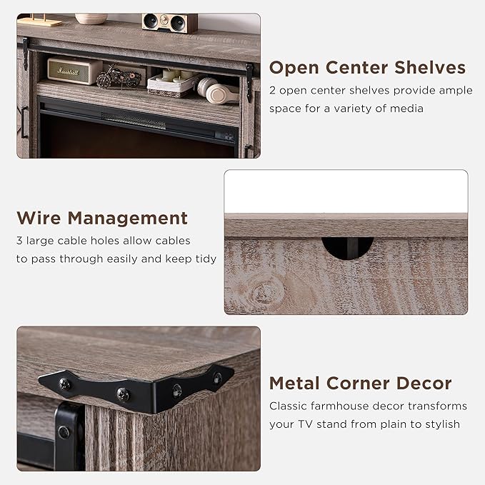- Farmhouse Fireplace TV Stand: Bring warmth and elegance to your home with this modern farmhouse TV stand, suitable for TVs up to 80". The freestanding design and stylish two-tone finish make this 70" unit a striking centerpiece in any room. Sliding barn doors reveal or conceal the center section, blending comfort with rustic charm to enhance your home’s ambiance.