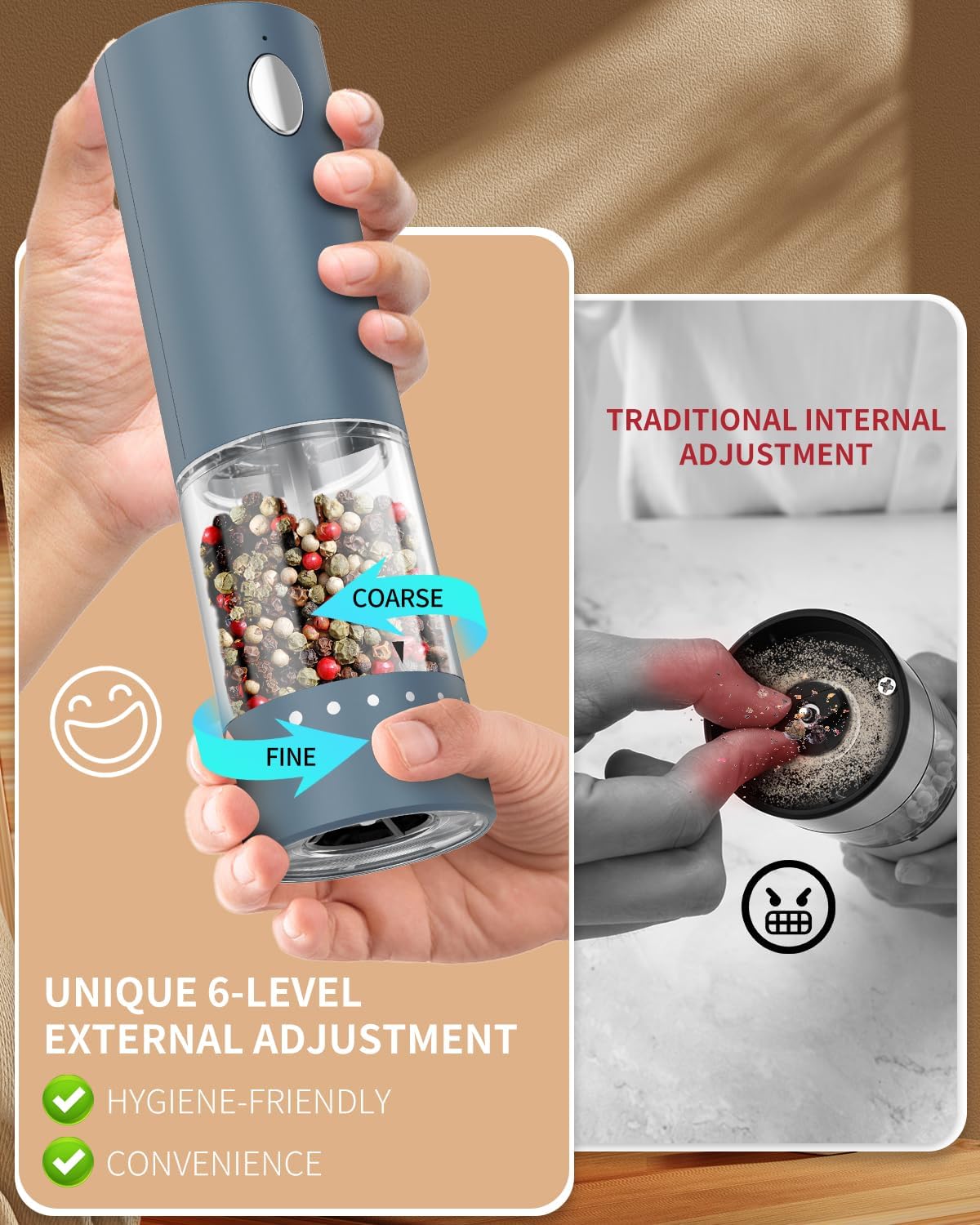 - ✔️ONE-HANDED OPERATION - With a simple press of the button, this rechargeable electric pepper grinder set offers effortless and user-friendly operation, allowing you to season your dishes with just one hand. The transparent acrylic container design lets you know how much seasoning is left and differentiate between different seasonings