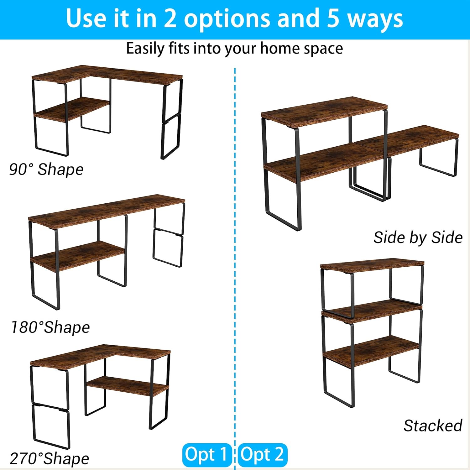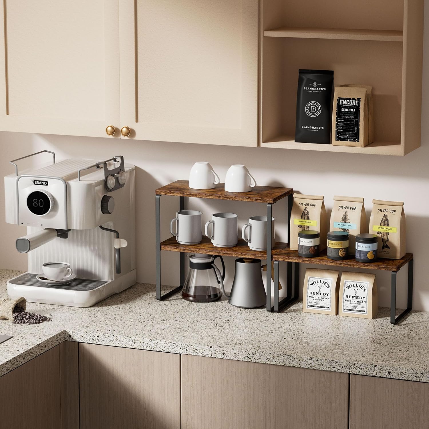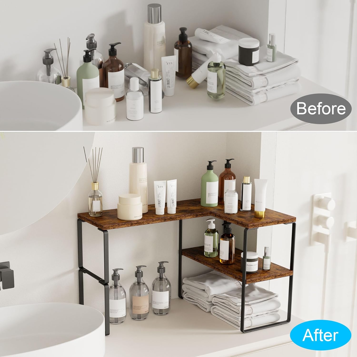 Large Countertop Organizer Corner Shelf, 2 Tier Adjustable Stackable Corner Shelves for Kitchen, Bathroom, Spice Rack, Coffee Area, Over Sink, Dresser Table, Corner Counter Shelf Stand, Rustic Brown