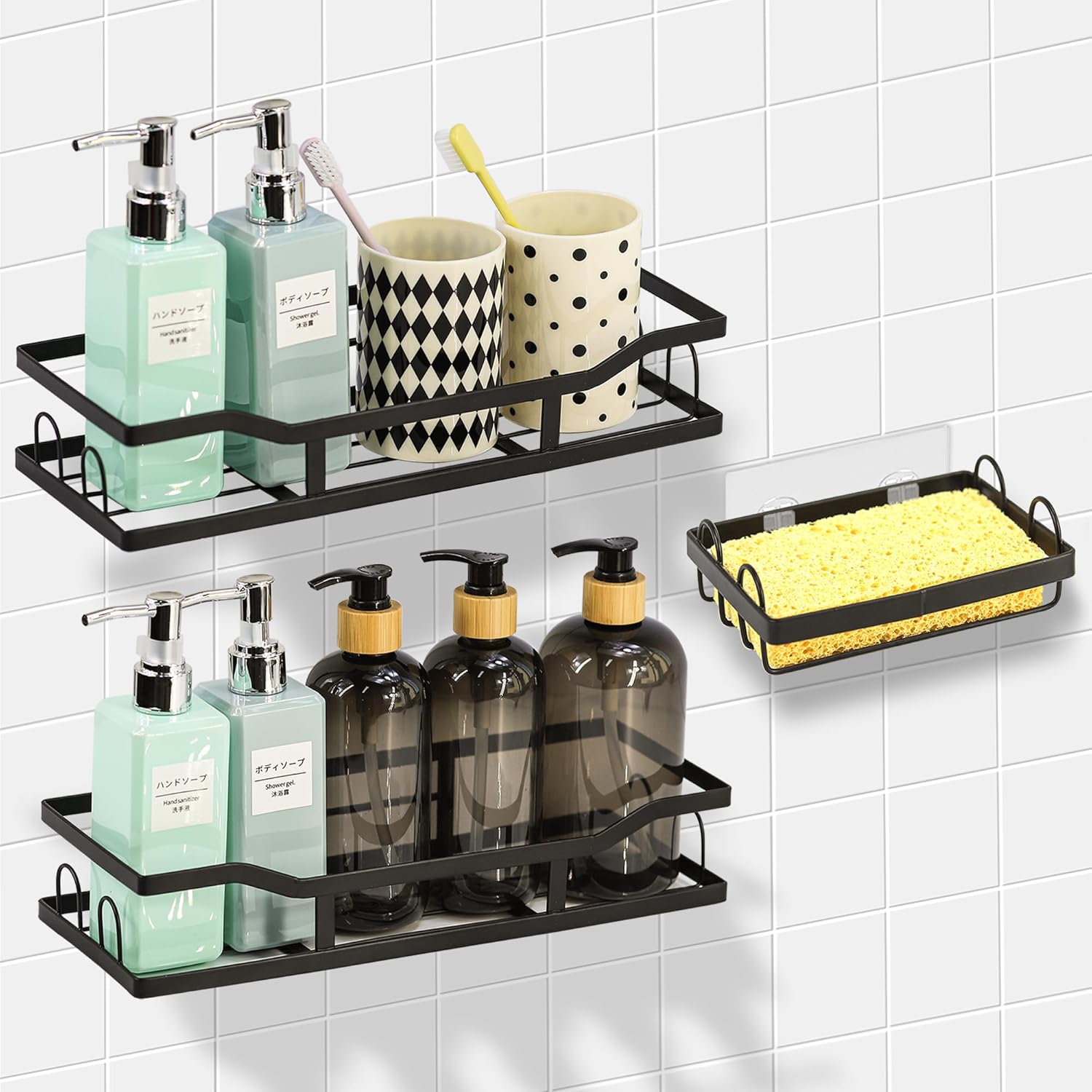 - ăWhat you getă Multi-Functional 3-Pack shower organizer set, including 2 shower caddies, 1 soap holder and 3 adhesives, each shower shelf has two hooks on both sides, storage shelf, and dual side hooks for bath sponges, razors, shower brushes and other washing accessories.