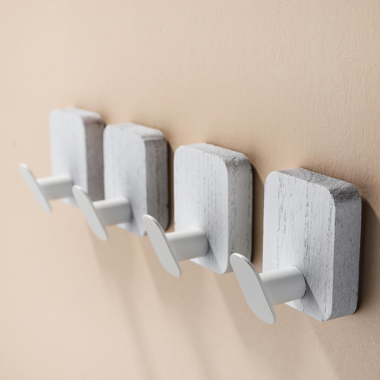 DELITON Wood Wall Hooks, Adhesive Towel Hooks for Hanging Wall Mounted, 4 Packs Coat Robes Hats Command Hook Heavy Duty No Damage, White