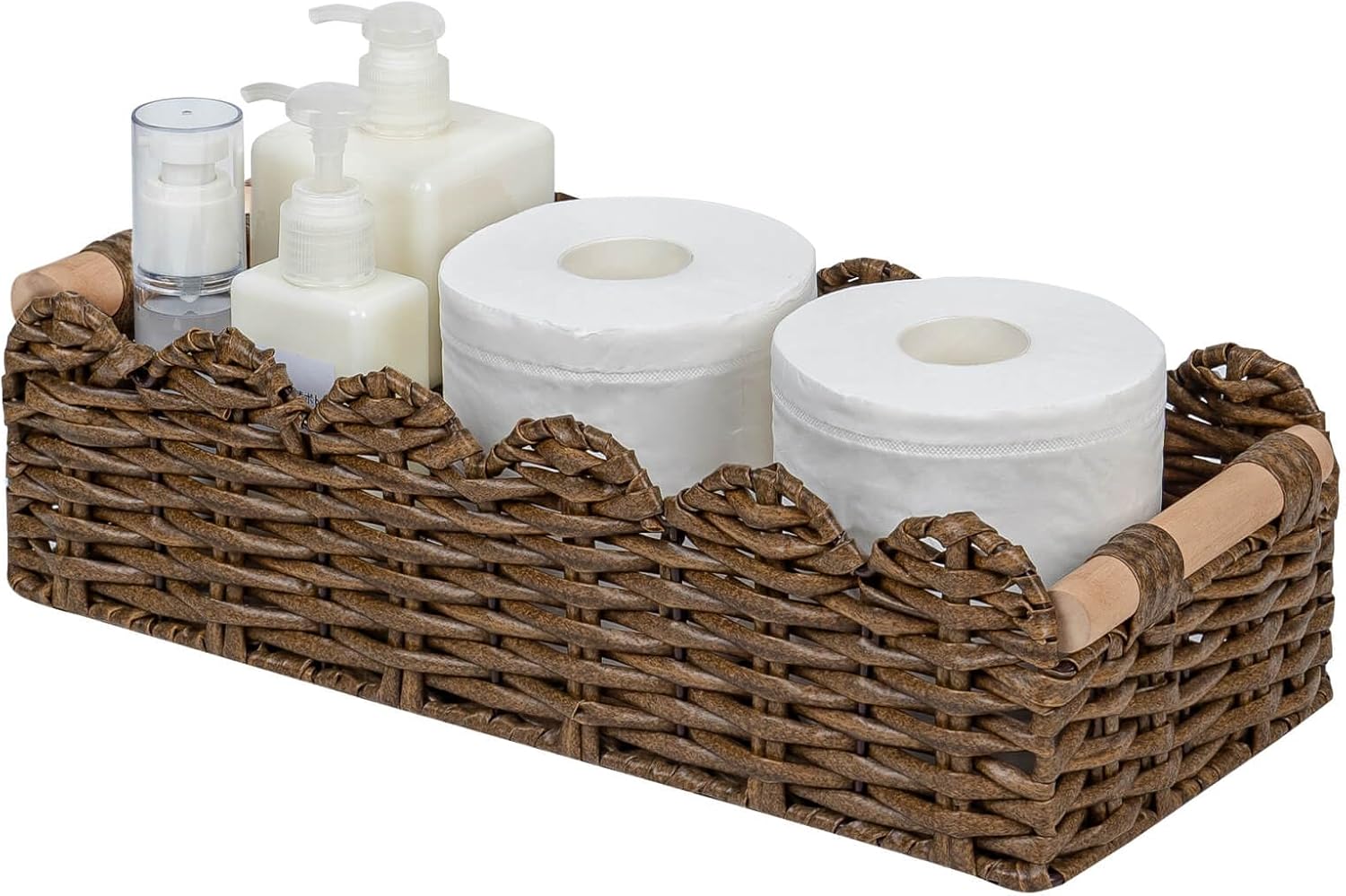 CubesLand PP Wicker Scalloped Edge Floating Shelves Baskets, Toilet Paper Basket for Over Toilet Storage Shelf, Ending Table, Cabinet Organizing and Home Décor, Rattan Basket with Wood Handle,Brown