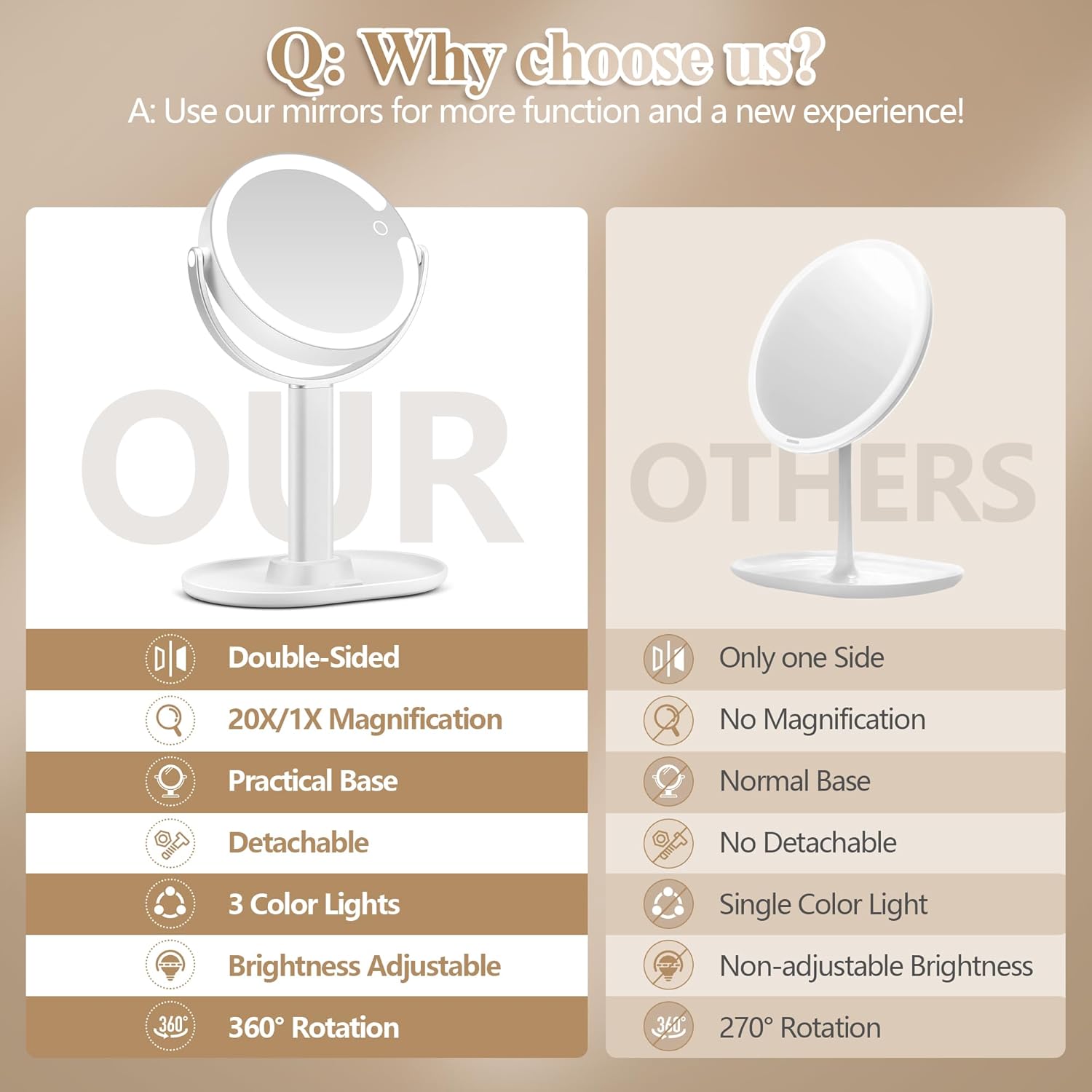 - 【20X Magnified Vanity Mirror with Lights】This makeup mirror with lights features double sided design with 1X and 20X magnification.The 1x mirror is a HD personal mirror for daily using.20x magnifying mirror with powerful maginfication will help you complete variety of fine makeup,especially for weak eyes (such as applying eye shadow, eyeliner, eyebrow trimming, wearing contact lenses and checking for fine lines,etc)