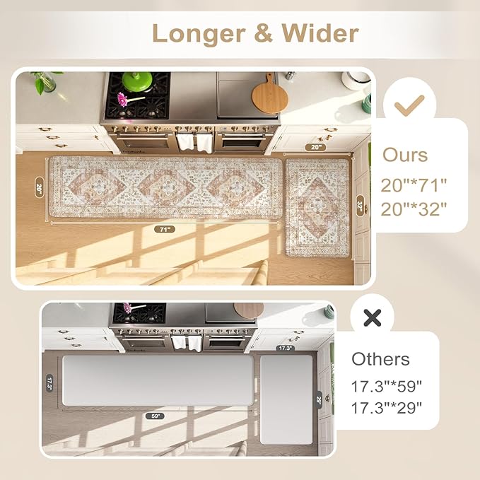 - Wider & Longer Kitchen Rugs 2PC:The set contains 2 rectangular kitchen mats measure 20"x71"+20"x32" which are wider than ordinary kitchen mats on the market.The mats are made of premium materials, which are friendly to your kids and pets
