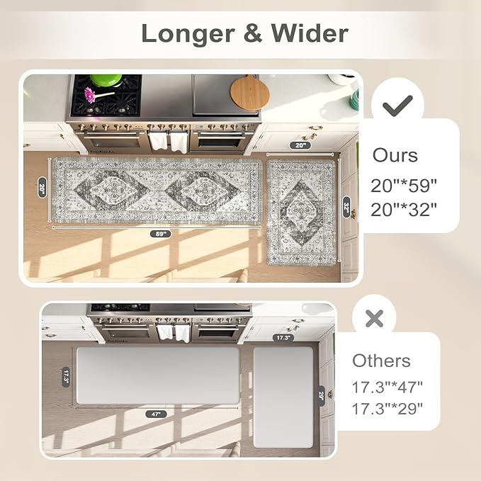 - Wider & Longer Kitchen Rugs 2PC:The set contains 2 rectangular kitchen mats measure 20"x59"+20"x32" which are wider than ordinary kitchen mats on the market.The mats are made of premium materials, which are friendly to your kids and pets