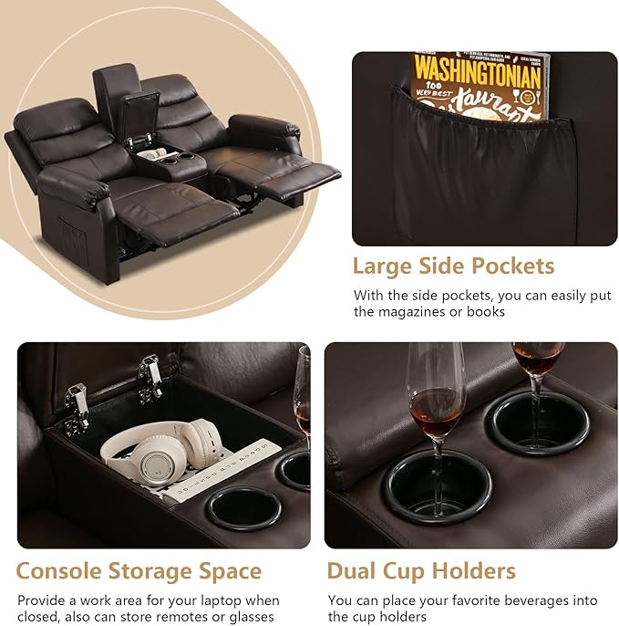 - Central Console with Functional Design: The recliner is equipped with a console between the seats, adding extra functionality. The integrated storage compartment and storage pockets provide spacious storage space for remotes, magazines or other small items that need to be kept nearby. It also comes with two cup holders for more drinks or snacks