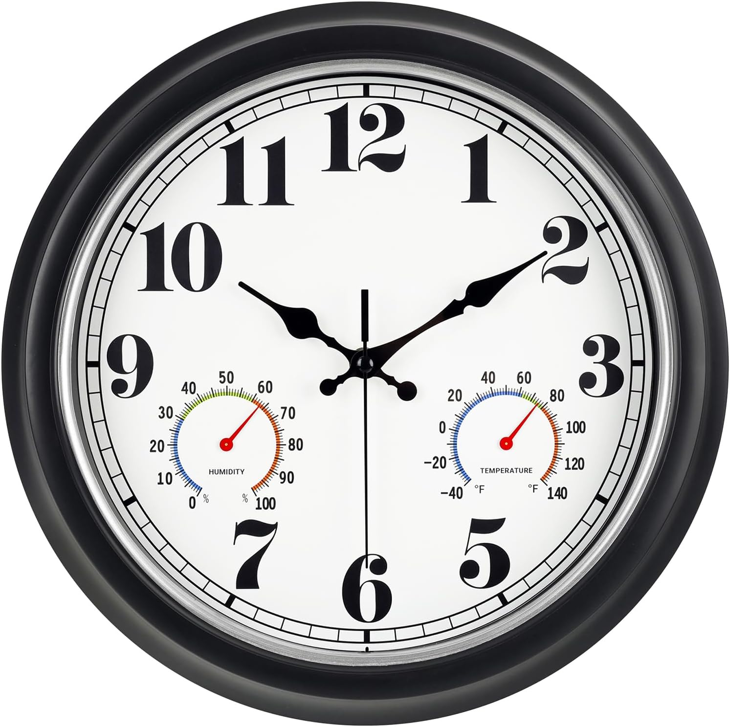 45MinST 13-Inch Vintage Outdoor Wall Clock with Thermometer and Hygrometer, Waterproof, Large Numbers, Silent, for Indoor and Outside Use,Porch,Garden,Pool(Black Frame with Silver Trim)