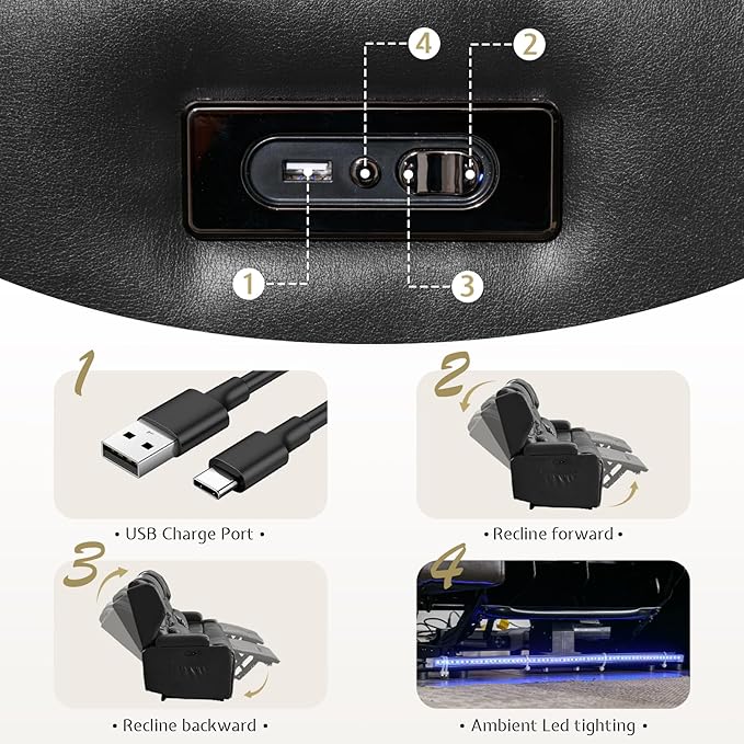 - Flip-Up Backrest: Flip up the backrest to create a separate seat. When lowered, it transforms into a practical wooden tabletop. Stay powered up with USB-A, USB-C ports, and 2 power outlets for charging devices. Enjoy four-color LED lighting at the base for a cozy, cinematic vibe. Perfect for movie nights, relaxing, or working from home