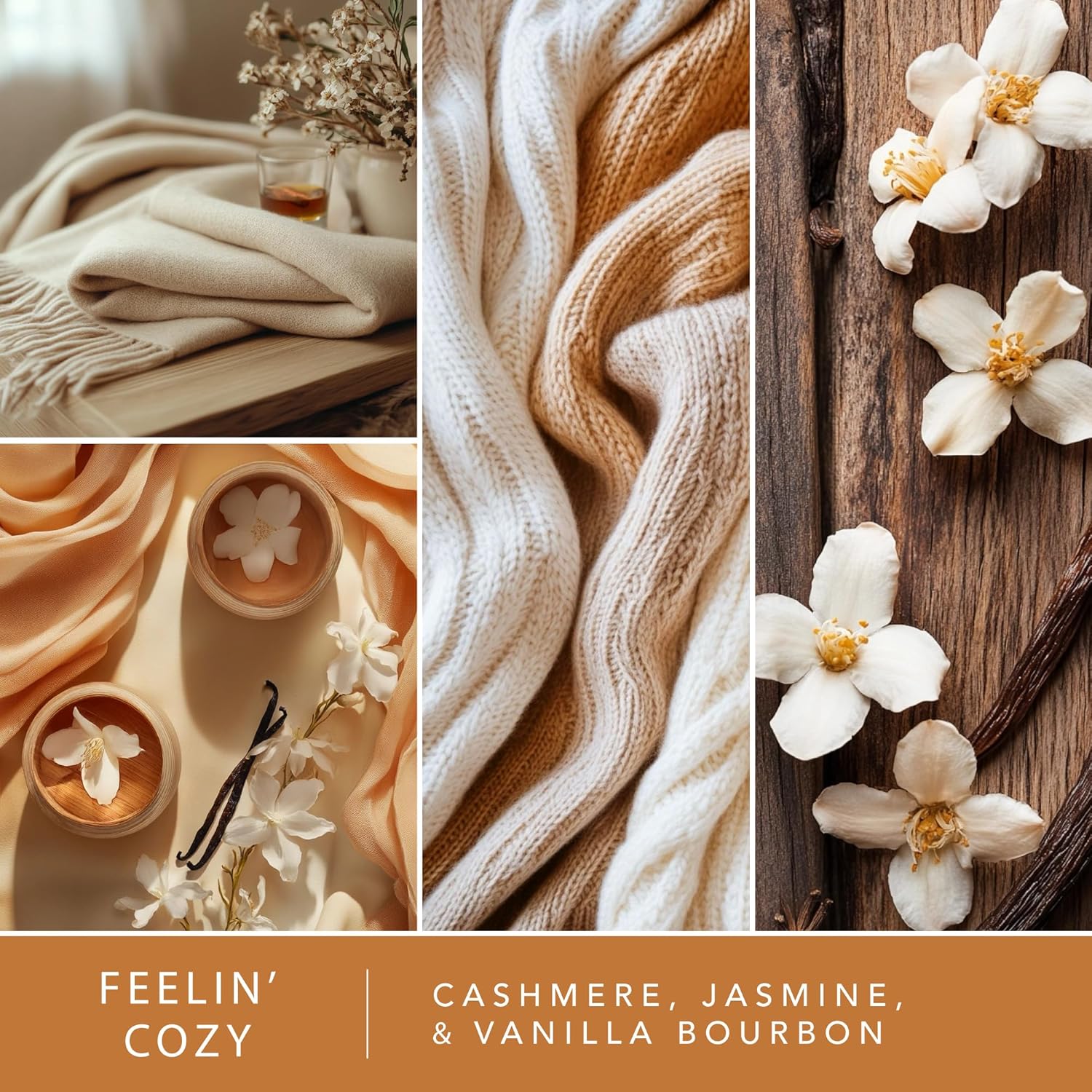 - CASHMERE, JASMINE, & VANILLA BOURBON - A cozy glow blooms from within as soft florals mingle with gentle warmth—jasmine and rose wrapped in creamy cashmere, blonde woods, and a smooth touch of vanilla bourbon.