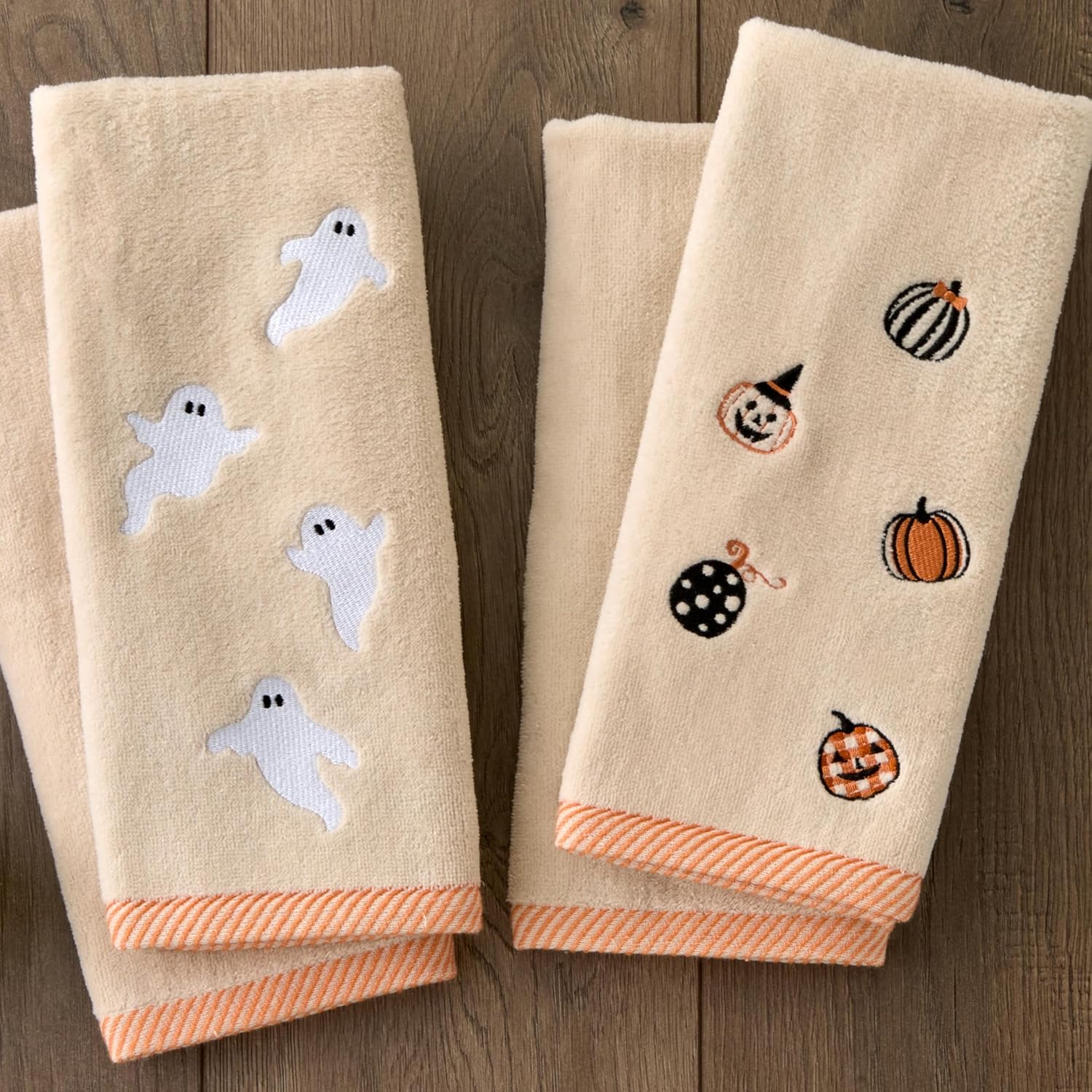 SKL Home Halloween Tossed Pumpkins 100% Cotton Embroidered 2pc Hand Towel Set, Decorative for Bath/Kitchen/Bar & Gift, Taupe