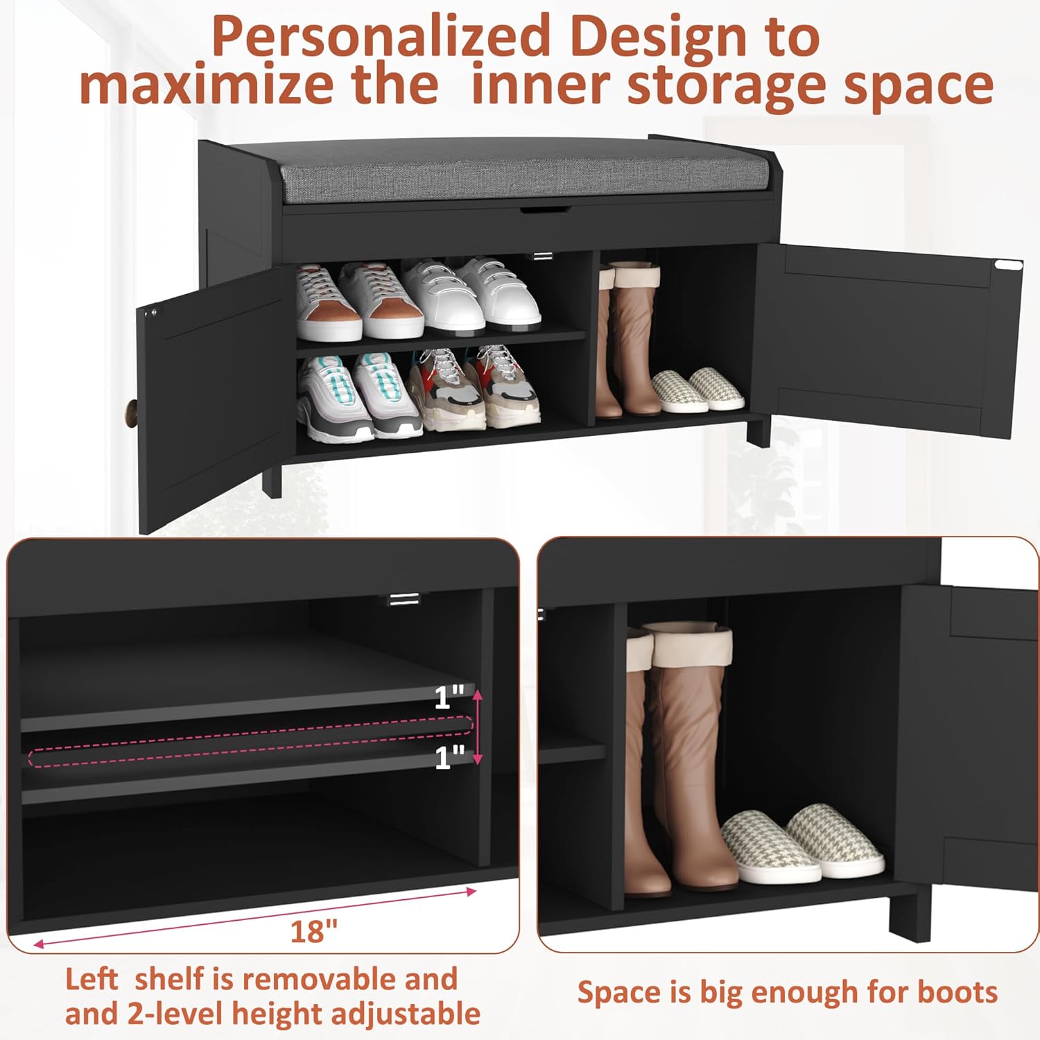 - Multipurpose Storage Solution for Compact Spaces: With its proper height, comfortable seating, and roomy interior, this shoe bench features multiple shelves for shoes, boots, and high heels, along with two cabinet doors to protect footwear from dust or pets. Measuring 30" W x 14.9" D x 18.1" H, this storage bench is an ideal solution for compact entryways or hallways. It offers ample space for shoes, bags, and more, helping to keep your entryway neat and organized for a welcoming first impression for guests.