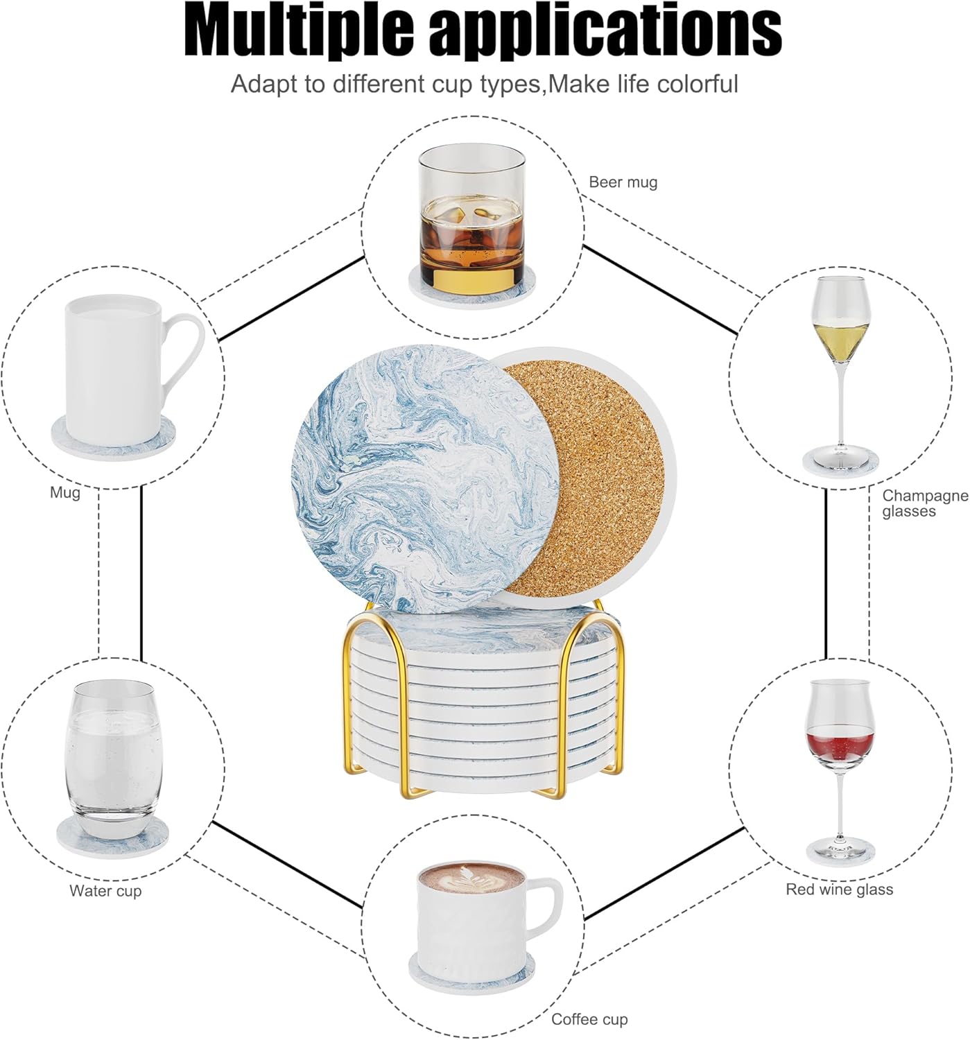 Coasters for Drinks Set of 8, Absorbent Abstract Light Blue Marble with Metal Golden Holder, Ceramic Coaster Set Cup Mat for Home Decor, Bar, Kitchen, Party