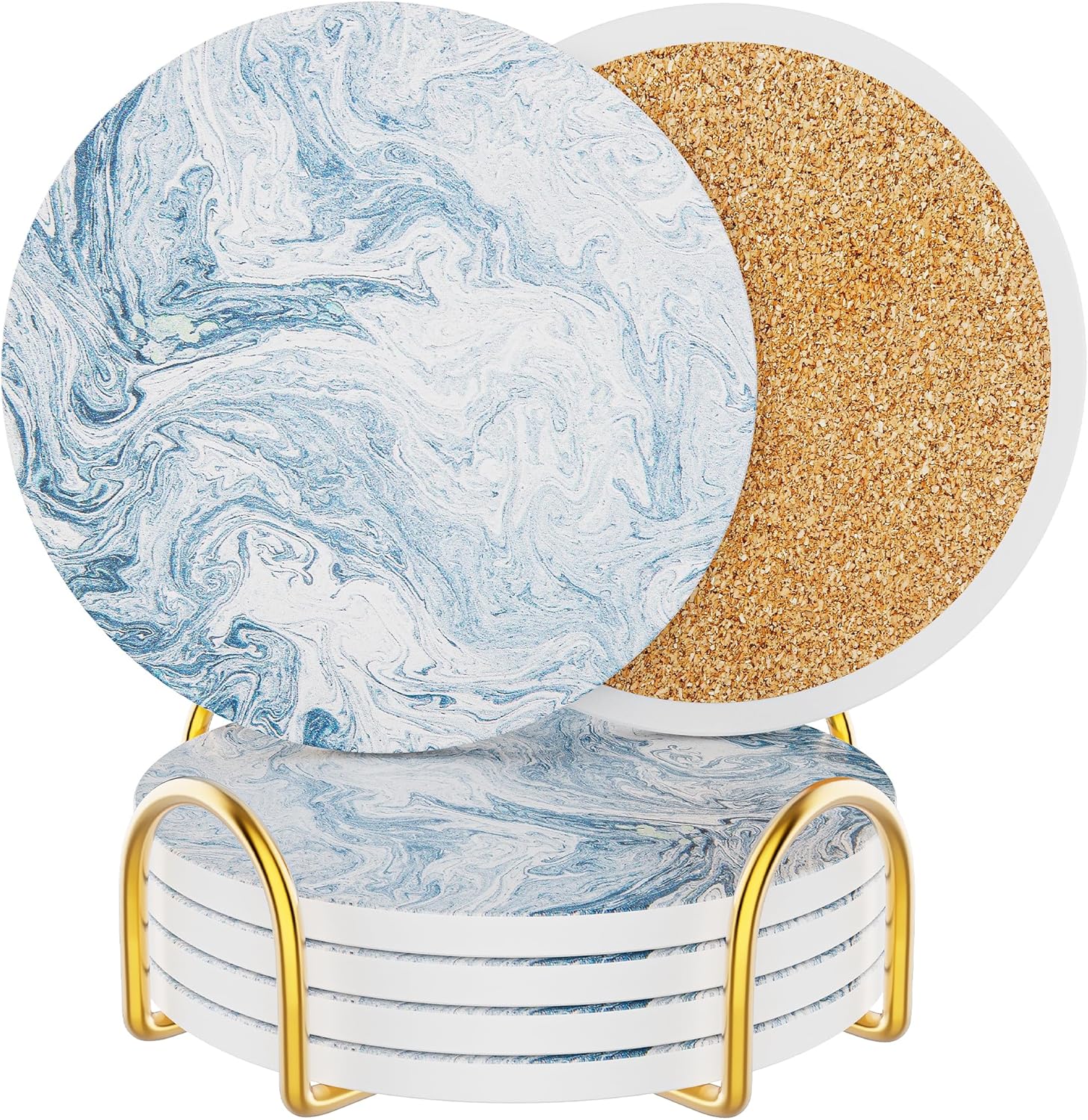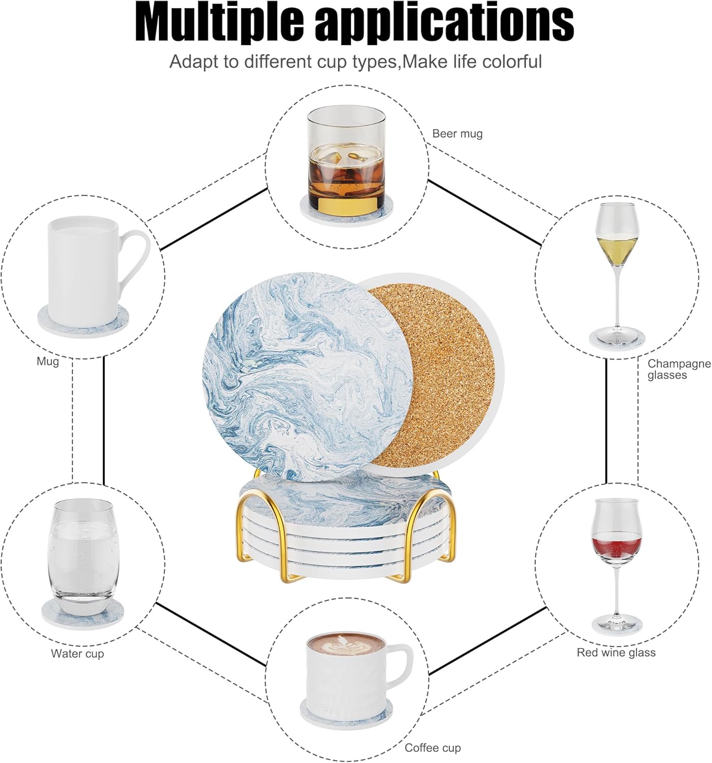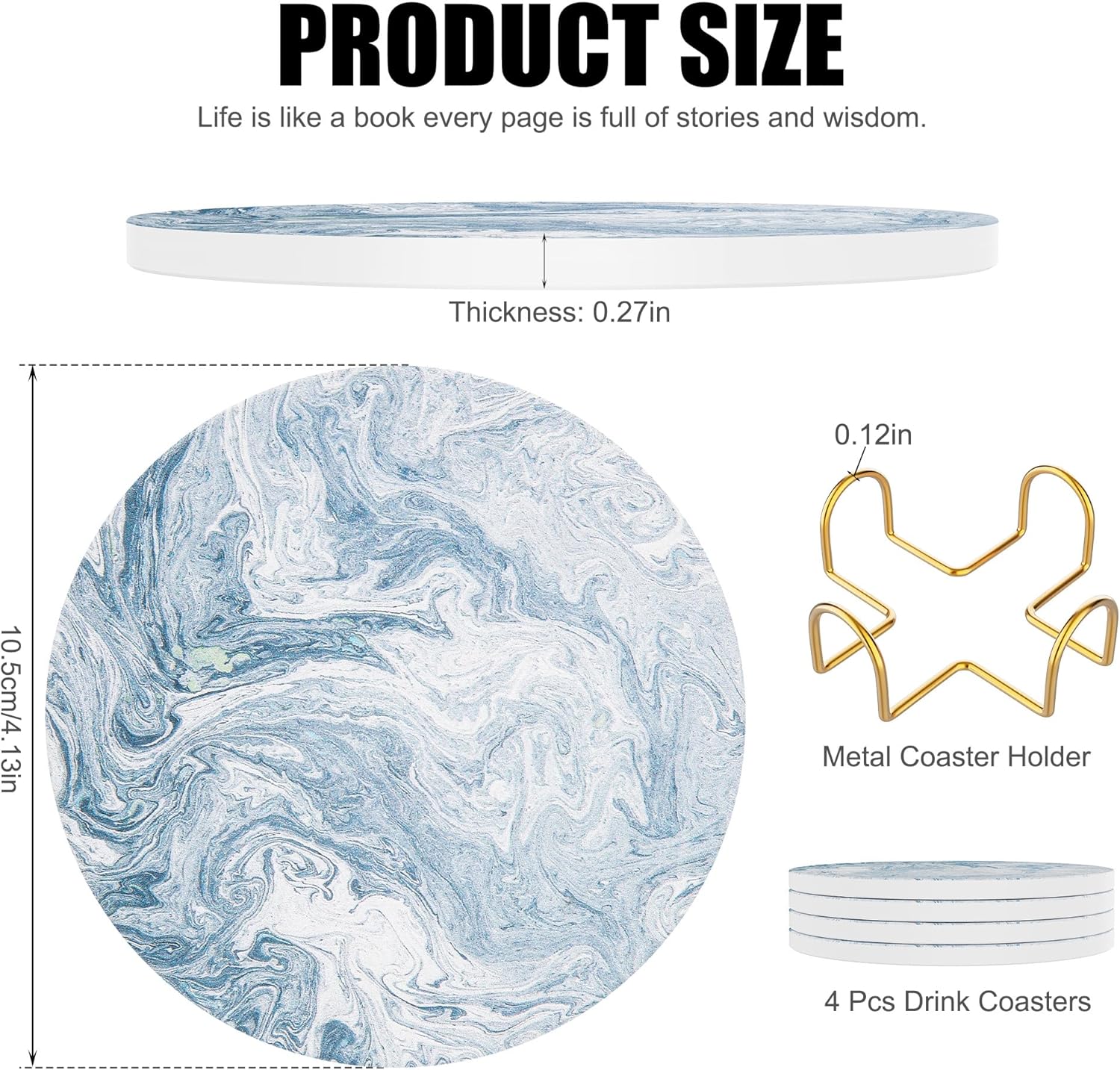 Coasters for Drinks Set of 4, Absorbent Abstract Light Blue Marble with Metal Golden Holder, Ceramic Coaster Set Cup Mat for Home Decor, Bar, Kitchen, Party