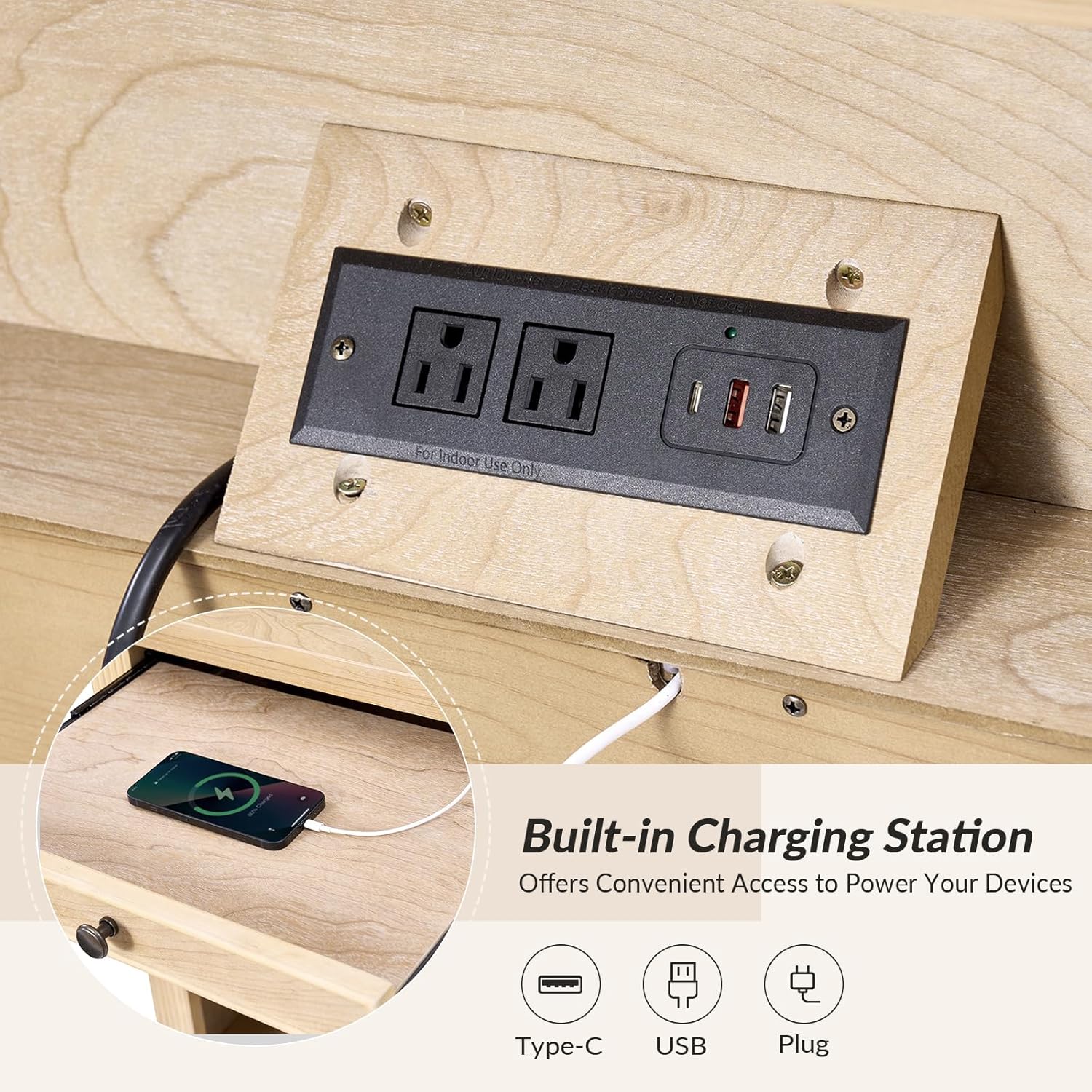 - Built-In Charging Hub: Equipped with two USB ports and a Type-C port, the rear power station keeps devices charged and cords tidy at your bedside
