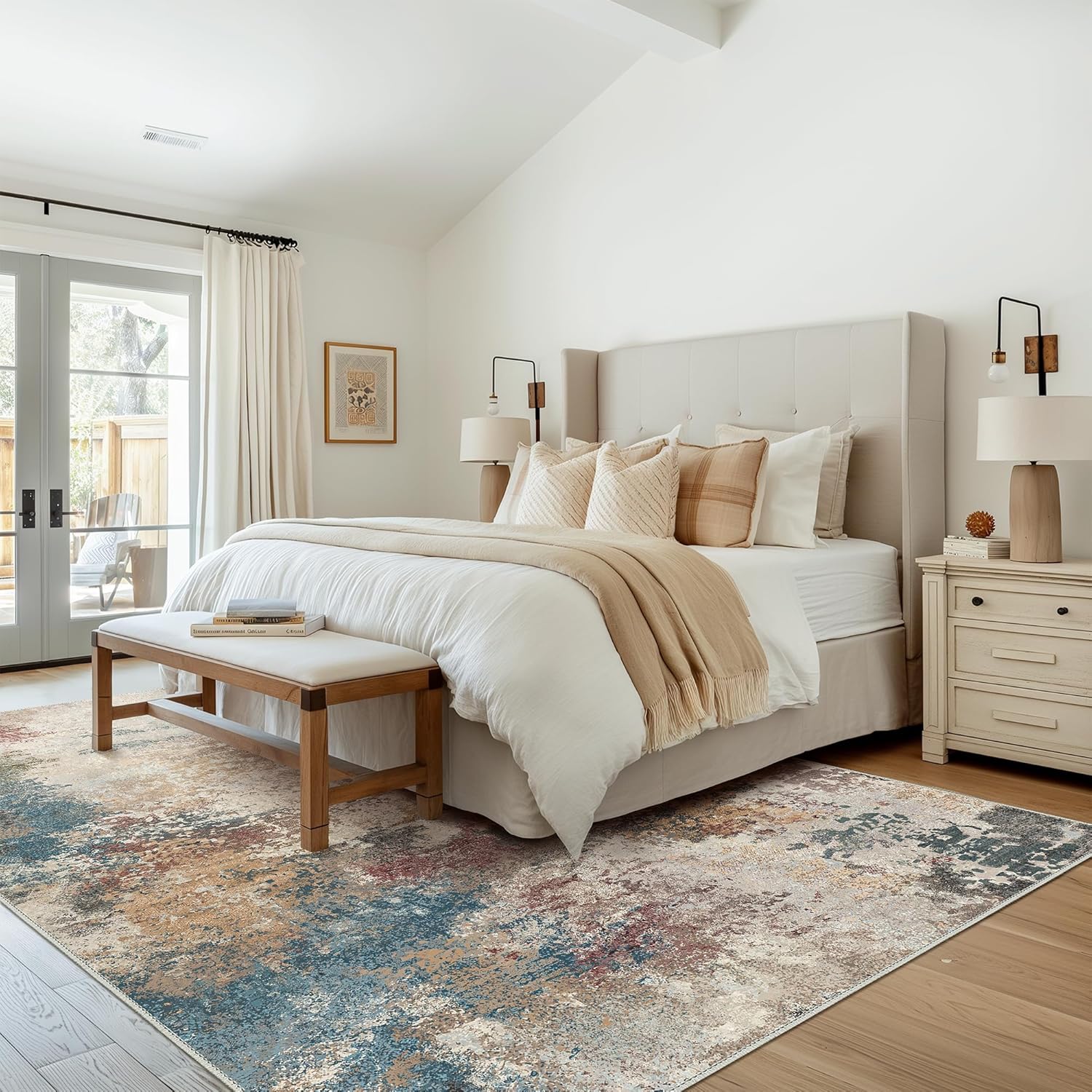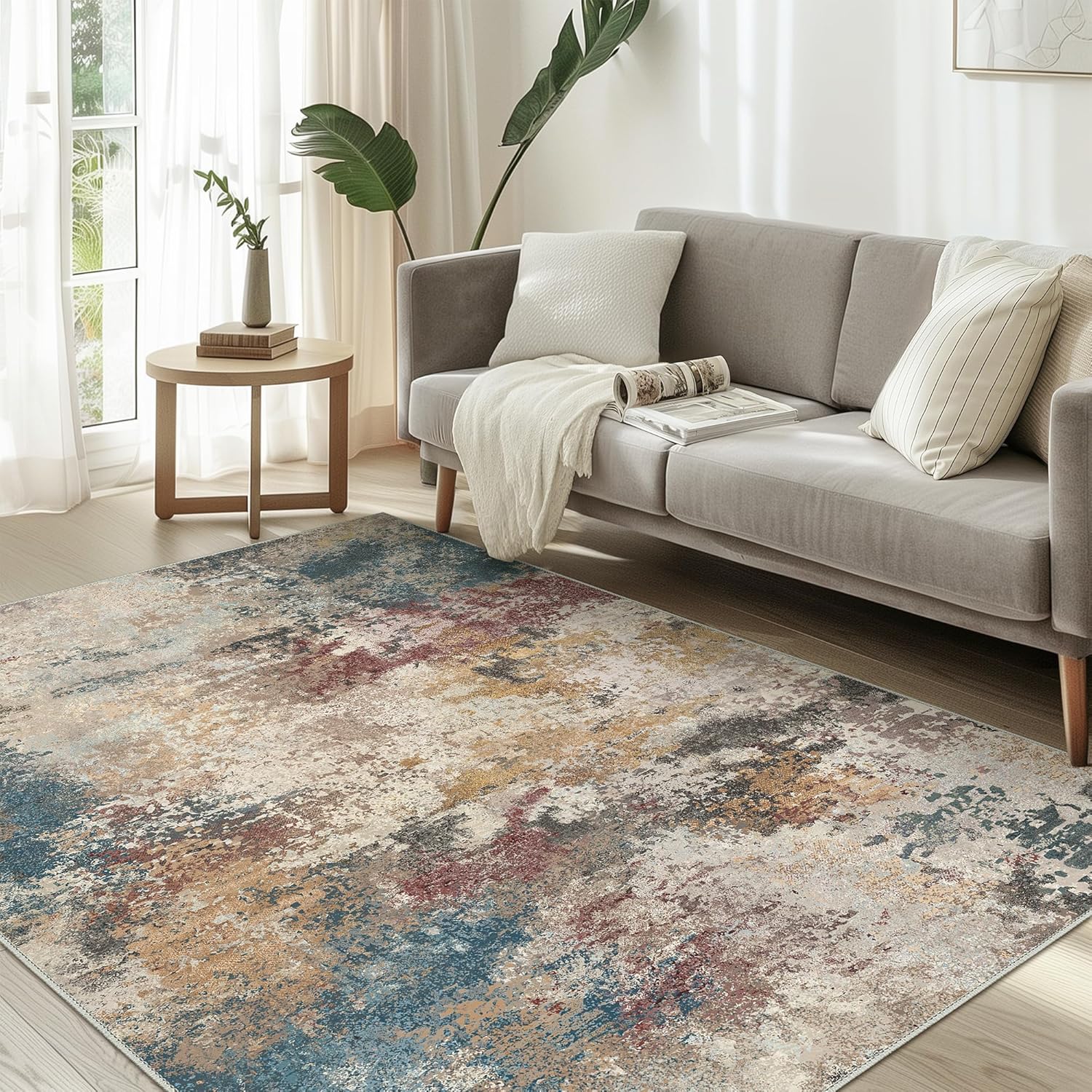 Area Rugs 10x14 Machine Washable Rug for Living Room Bedroom Dining Room, Large Modern Abstract Colorful Soft Rugs, Indoor Low Pile Carpet with Non Slip Rubber Backing, Multi Beige