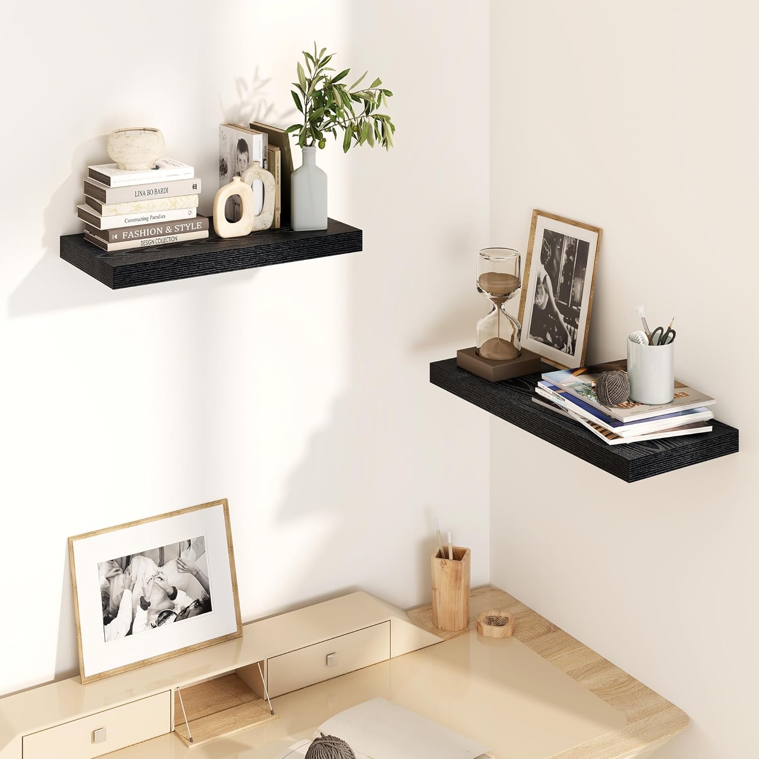 - ăDECORATIVE & FUNCTIONALăThe wall-mounted floating shelves are designed for decoration and storage, utilizing and decorating any space in your home. Used as shelf decor to show your collection, books, or prize, the hanging shelves are perfect for displaying your photo frame, small plants, model, or audio in your living room, office, study. And can also use as over the toilet storage shelf in the bathroom to hold toiletries or used as kitchen shelf to storage condiments.