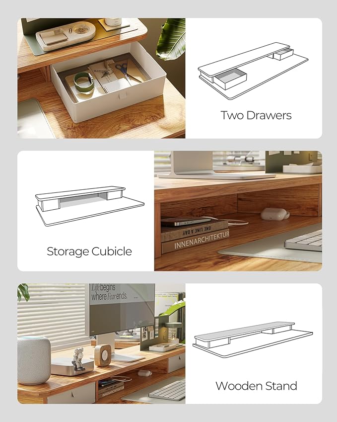 - Spacious Work Space: The top shelves with double drawer design expertly make your desktop tidier and helps you head up when you put your screen on it