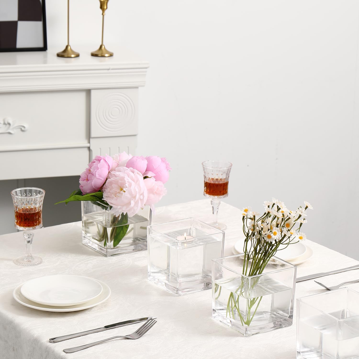 Square Glass Vases Set of 4, 5" x 5" x 5" Clear Flower Vases for Centerpieces, Square Vase for Flowers, Small Vase for Wedding, Party, Home Office Decoration